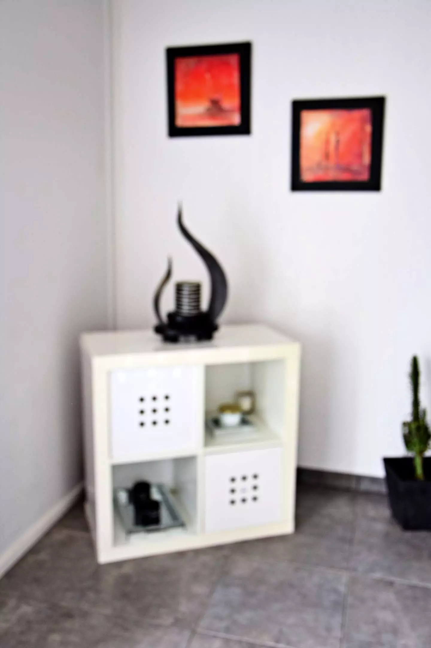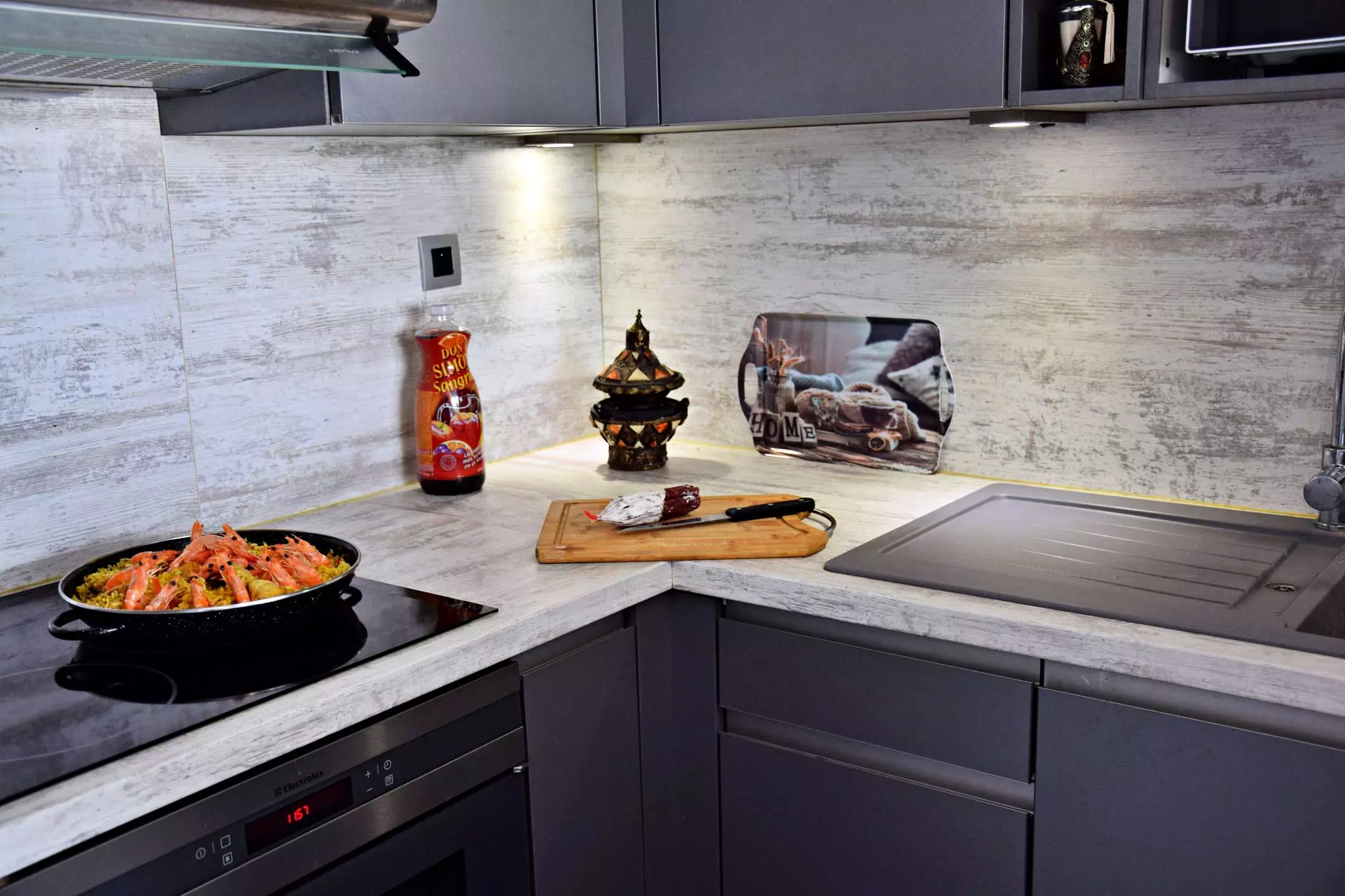 Bright and spacious living room: The living room is equipped with a comfortable sofa, a coffee table, a large flat-screen TV, and storage furniture, creating a pleasant space to relax after a sunny day. All this is complemented by Wi-Fi access and air conditioning for your comfort.