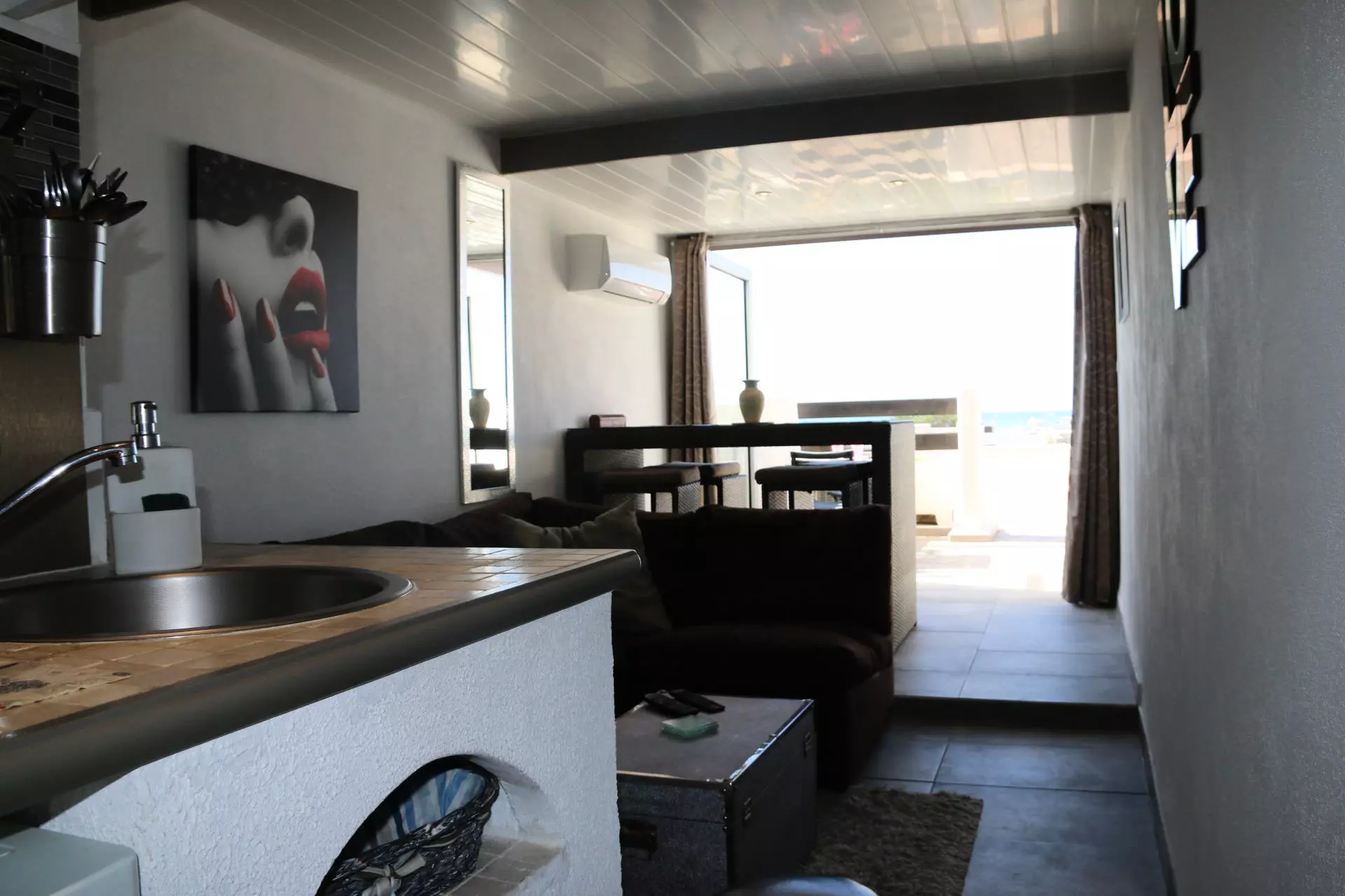 Air-conditioned apartment for 2 people, located in Port Nature colline 2, on the 2nd floor without elevator. Living room with kitchenette. Small bedroom with double bed (140cm). Bathroom area with shower and toilet. Terrace with sea view. No parking.