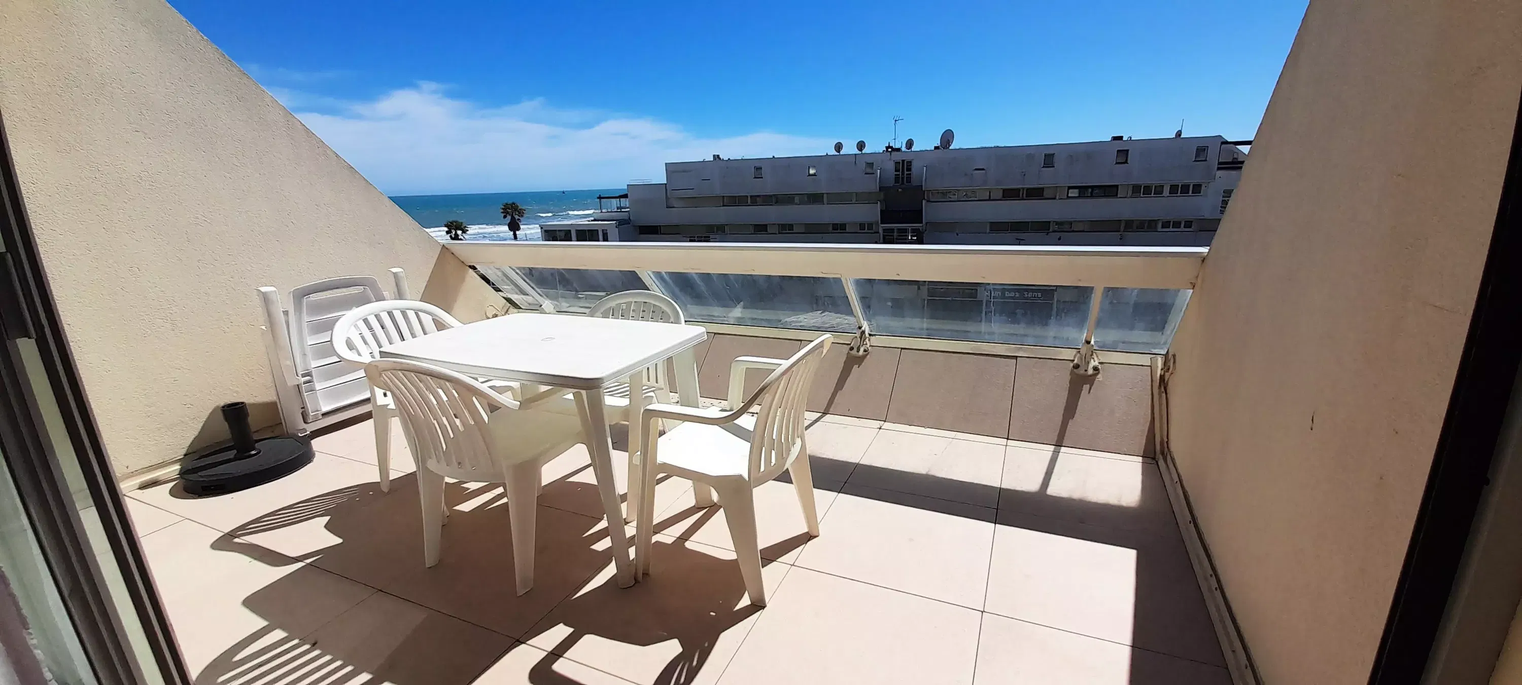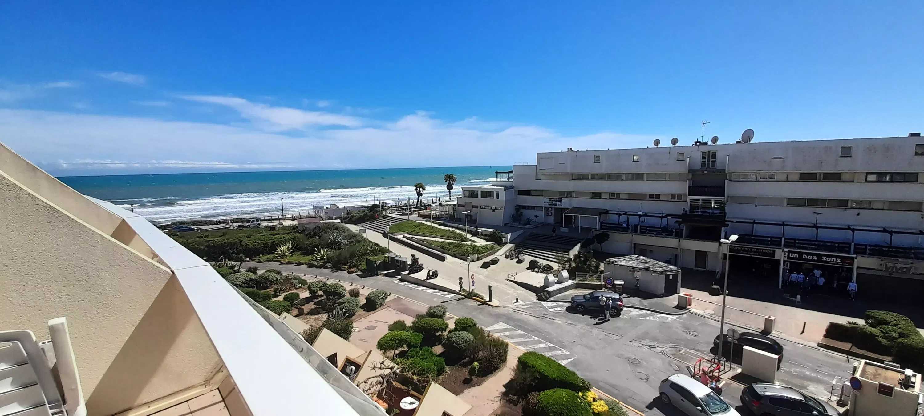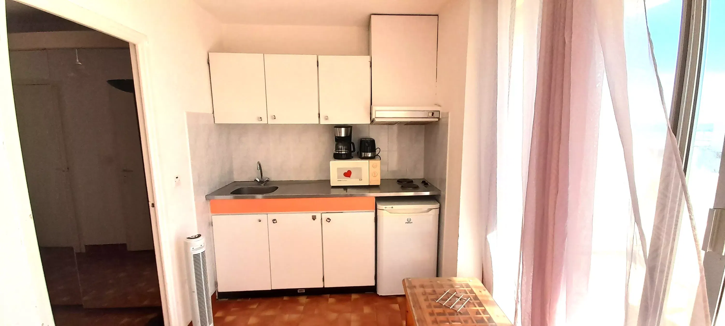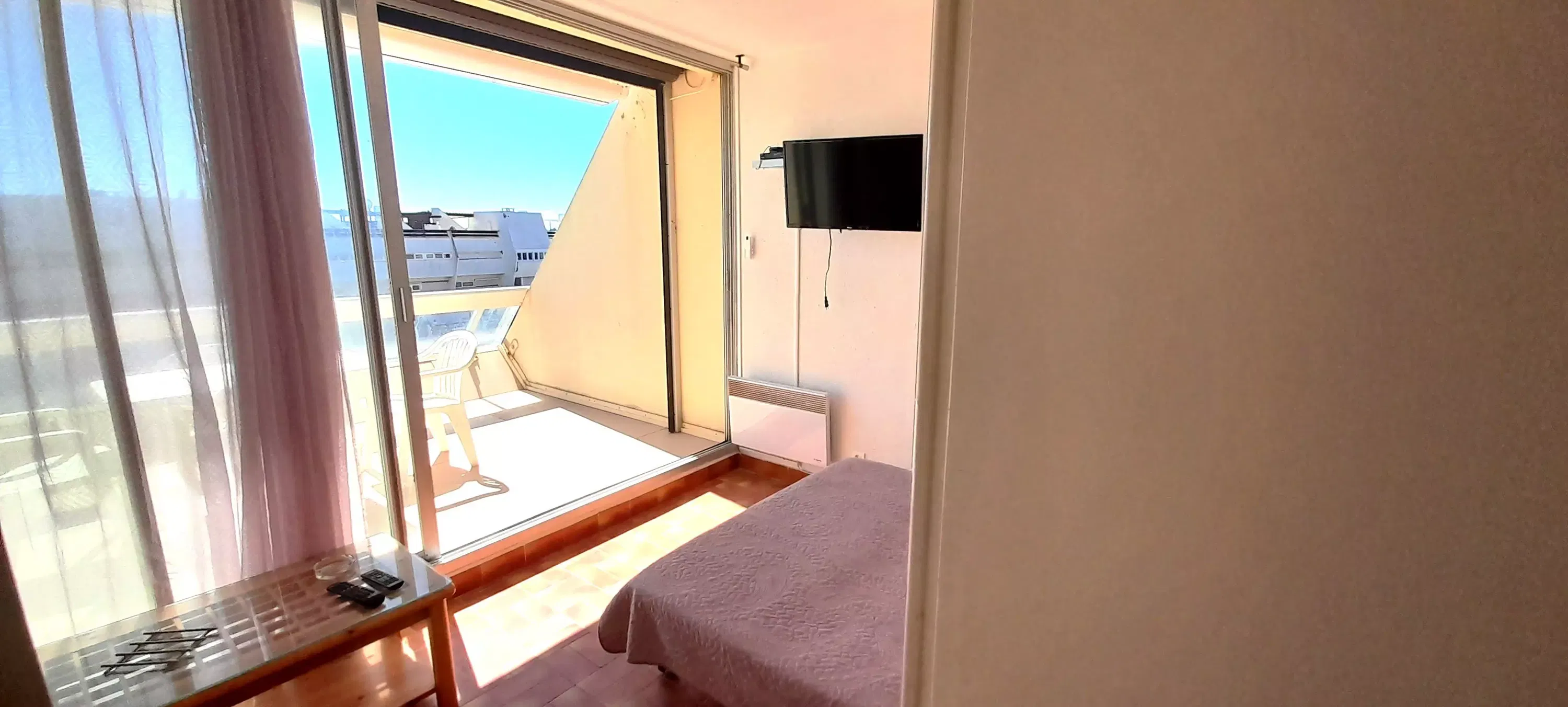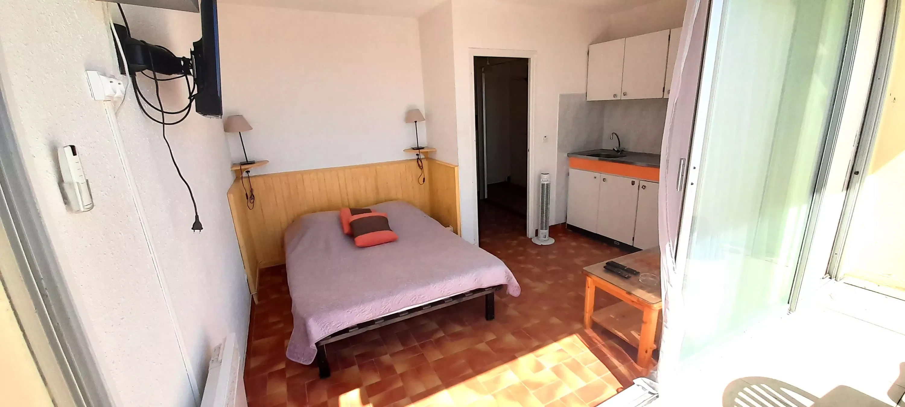Studio for 2 people, located in Héliopolis entrance D, on the 4th floor with elevator. Living room with a 140 cm sofa bed. Kitchenette with microwave, coffee maker, kettle, iron and ironing board, hairdryer and cooling tower. Television. Bathroom. Separate toilet. Terrace with an awning overlooking the sea and Port Nature. Parking n° 206 at P2.