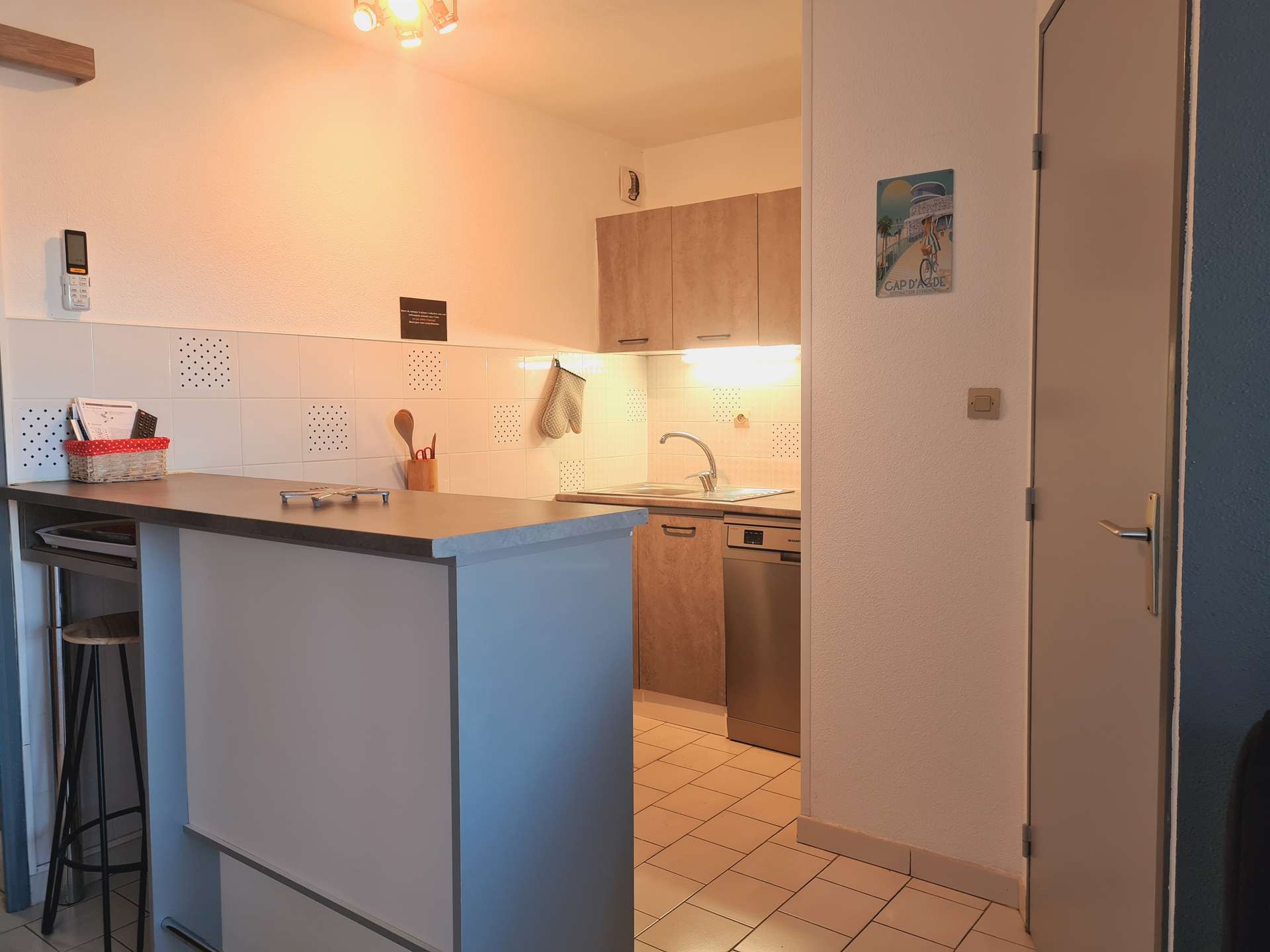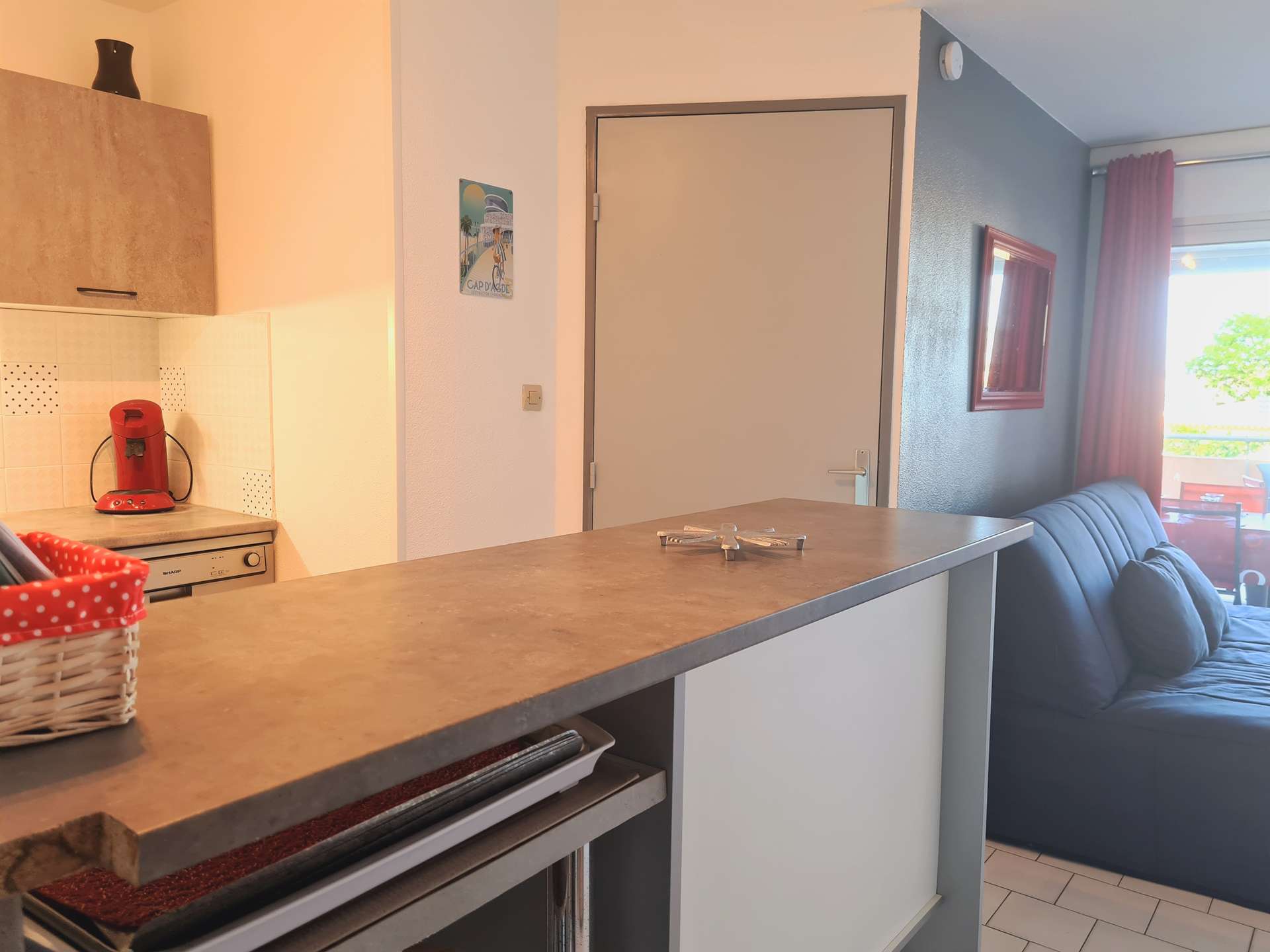 Cap d'Agde (34) - Quartier Des Falaises - Residence Port Gabriel II 2-room apartment with cabin area - approximately 30m² - up to 6 people Located 150 m from the nearest beach, the residence "Port Gabriel II" is composed of several 4-storey buildings with lift and is 500 m from the shops. This residence is close to the picturesque Grande Conque beach (volcanic beach). This holiday apartment located on the 1st floor with lift includes a living room with a 140 convertible sofa and a television, a bedroom with a 160 double bed, a cabin area with 2 90 bunk beds each, an equipped kitchen, a bathroom shower, separate toilet-pets not allowed. The "Plus" of this rental by the sea: private parking and swimming pool within the residence, washing machine, pleasantly renovated rental. Please note: swimming pool opening subject to changes linked to the COVID-19 situation End of stay cleaning included.