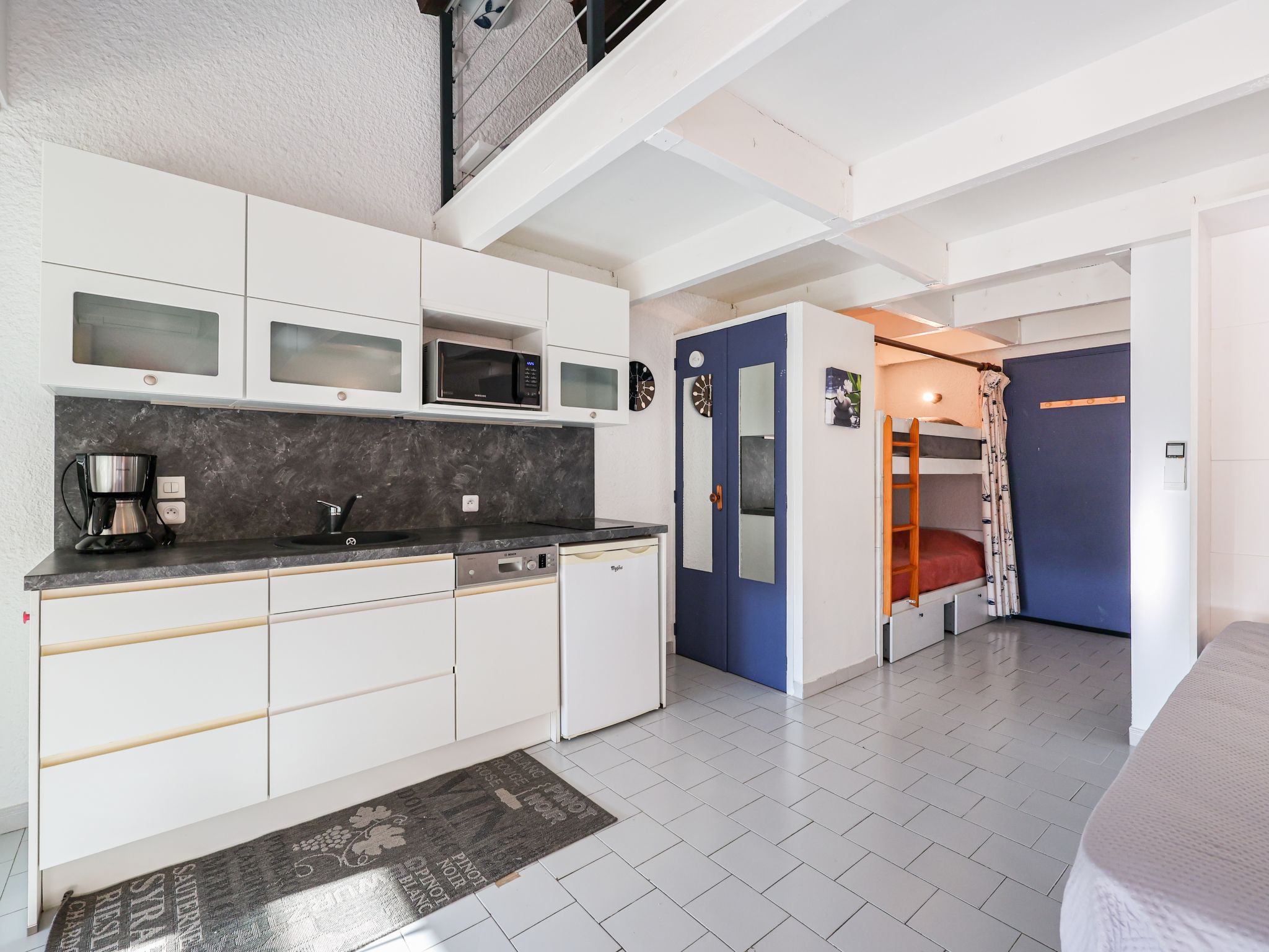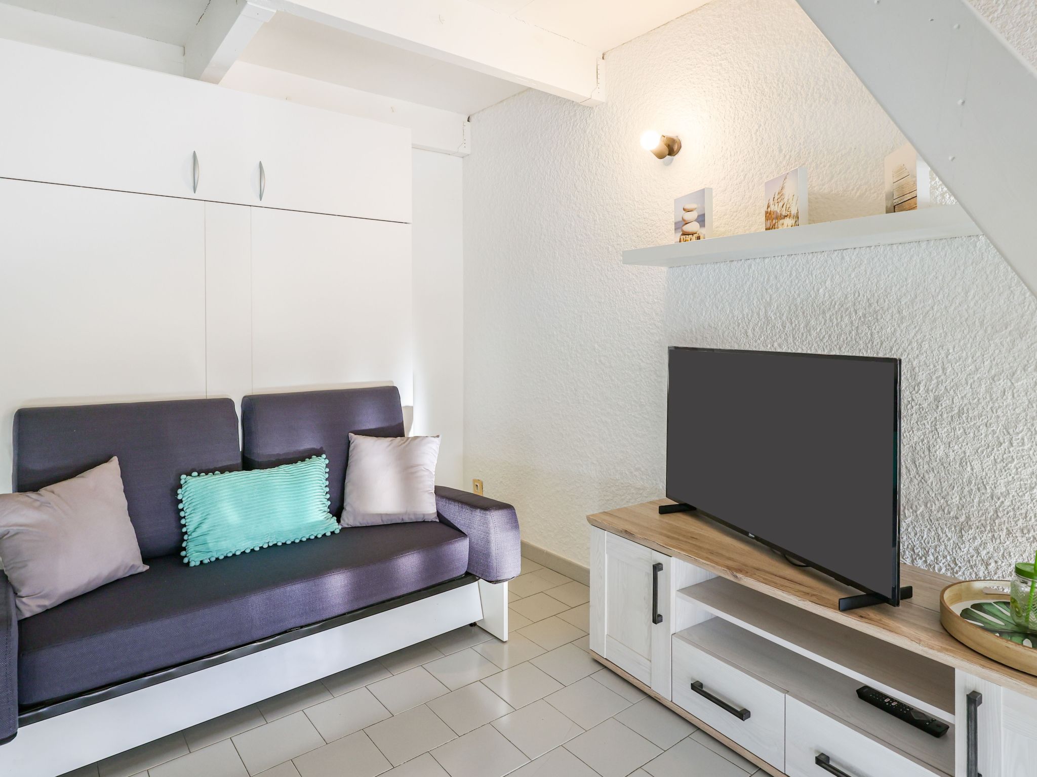 2-room apartment 35 m2 on 2 levels on 2nd floor. Living/dining room with TV (flat screen), air conditioning. Open sleeping alcove with 1 x 2 bunk beds (90 cm, length 190 cm). Open kitchen (dishwasher, 2 ceramic glass hob hotplates, microwave). Bathroom, sep. WC. Heating, electric heating. Upper floor: open gallery with sloping ceilings, ceiling height 96 - 122 cm with 1 french bed (140 cm, length 200 cm). Large balcony, south-east facing position. Terrace furniture. Beautiful distant view of the sea and the countryside. Facilities: Internet (WiFi, extra). Please note: suitable for families apartment street side. Fridge without freezer. Smoke alarm.