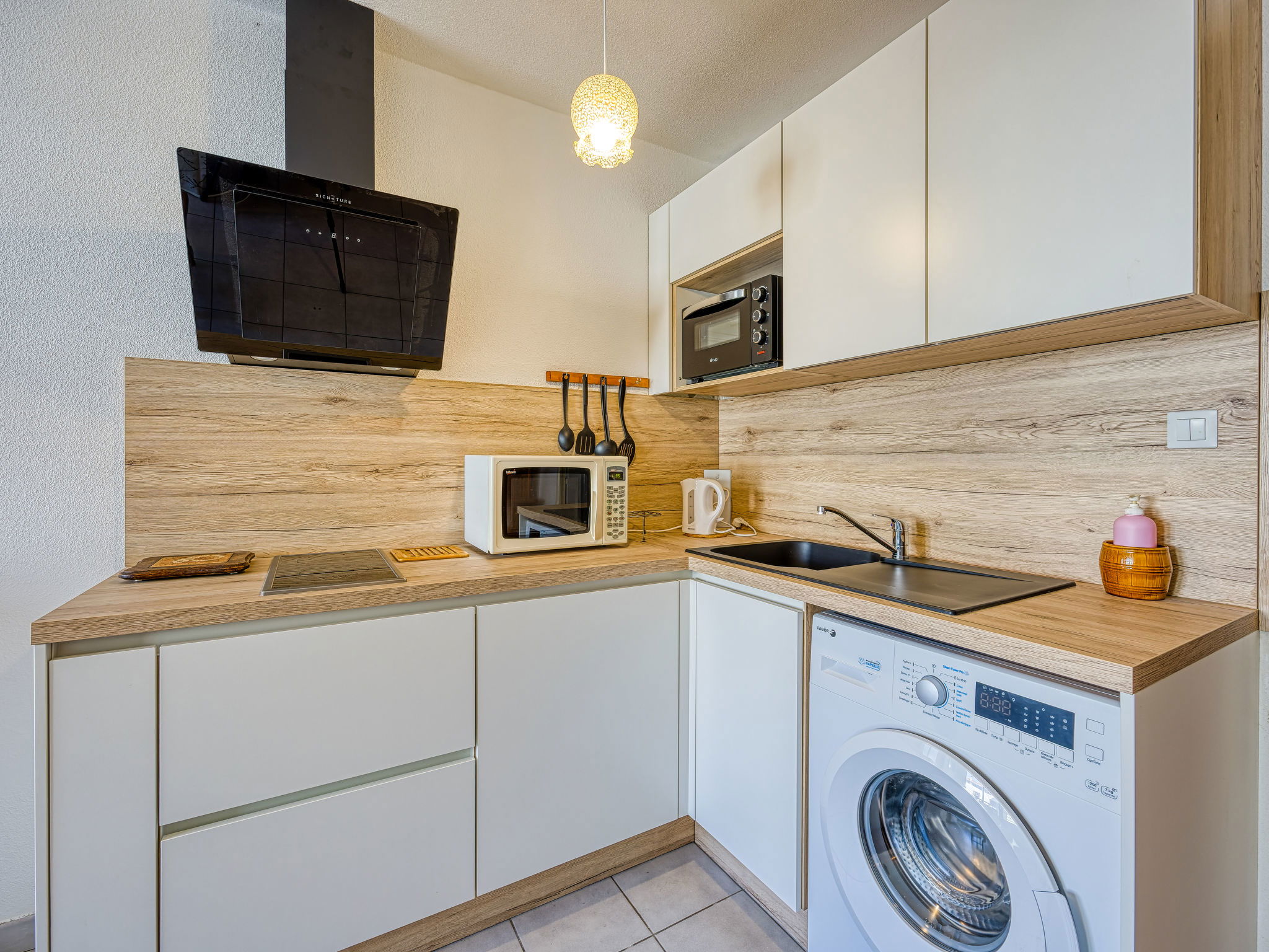 1-room apartment 27 m2 on 3rd floor. Living/dining room with 1 double sofabed (140 cm, length 190 cm), TV (flat screen). Exit to the loggia. Sleeping alcove with 1 x 2 bunk beds (90 cm, length 190 cm). Open kitchen (mini-oven, 2 ceramic glass hob hotplates, kettle, microwave, electric coffee machine). Shower, sep. WC. Electric heating. Side view of the sea. Facilities: washing machine. Internet (WiFi, extra). Please note: no parking. Maximum 1 pet/ dog allowed. Smoke alarm. Instead of an enclosed bedroom, some sleeping areas are located in an open-plan area (gallery, alcove, etc.). Offer by a private individual according to Art. 155, IV of CGI.
