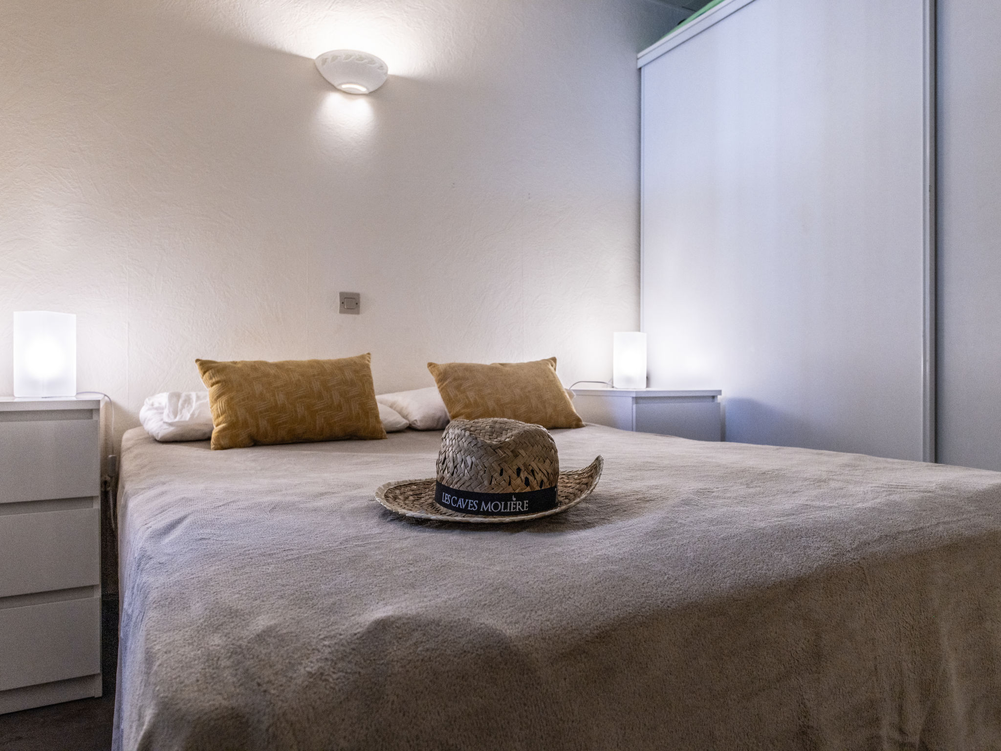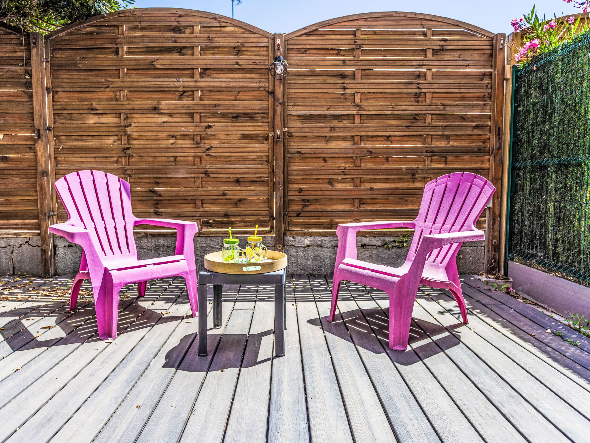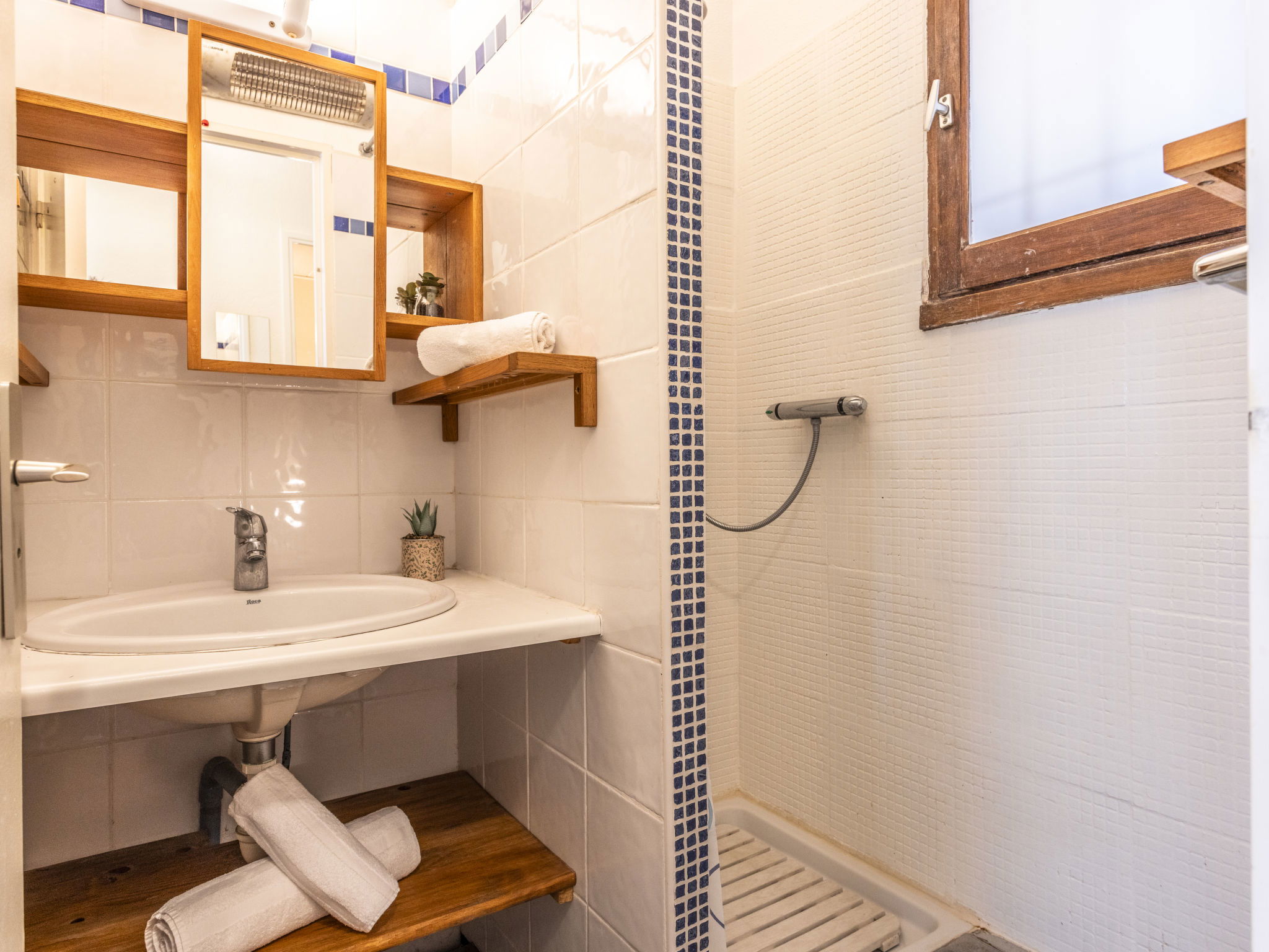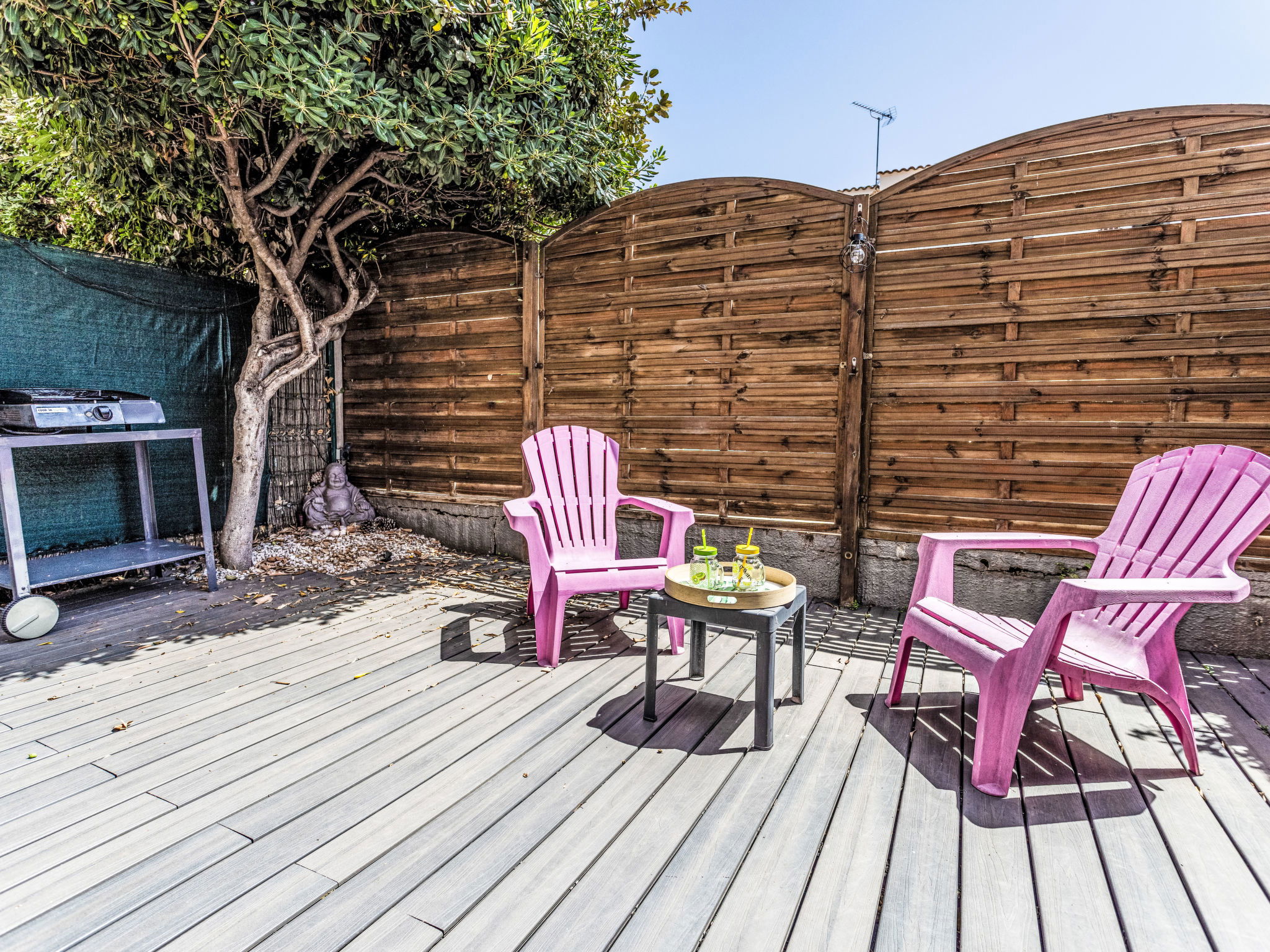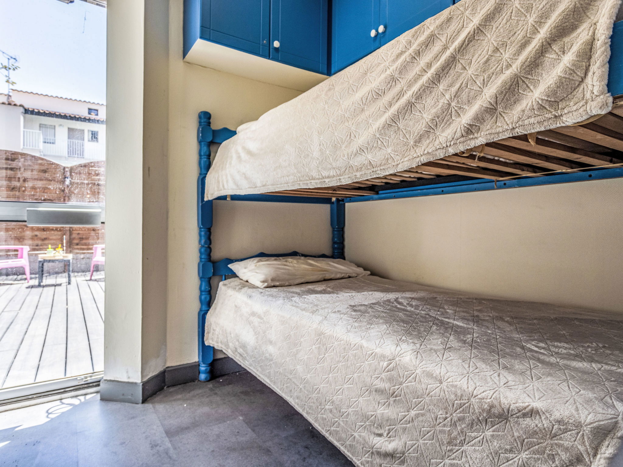 3-room apartment 30 m2, on the ground floor. Comfortable furnishings: living/dining room with TV (flat screen). Exit to the terrace. 1 room with 1 french bed (140 cm, length 190 cm). Sleeping alcove with 1 x 2 bunk beds (90 cm, length 190 cm). Kitchenette (4 hot plates, oven, toaster, kettle, microwave, electric coffee machine). Shower, sep. WC. Large terrace 30 m2. Terrace furniture. Facilities: washing machine. Internet (WiFi, free). Parking space n 12. Please note: smoke alarm. Offer by a private individual according to Art. 155, IV of CGI.