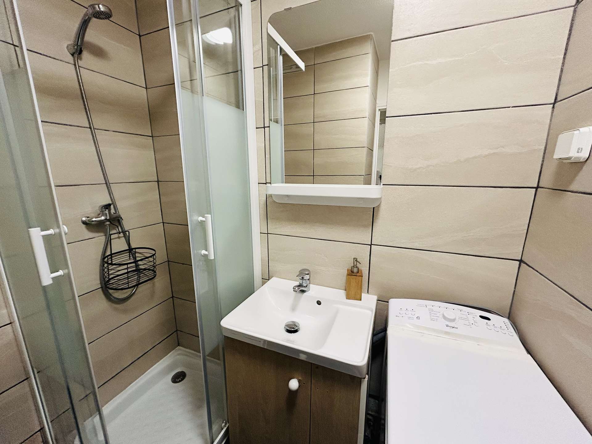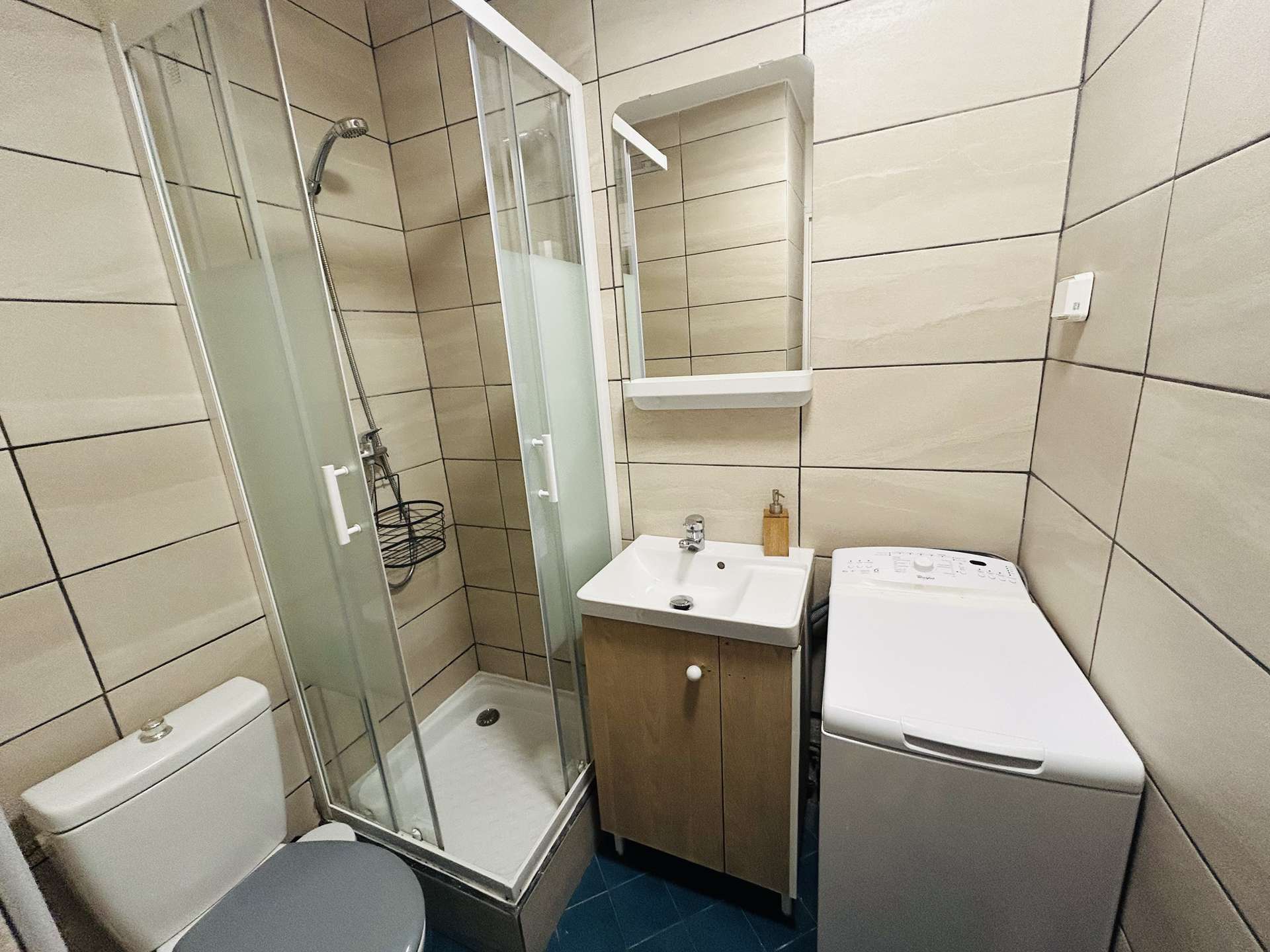 This holiday apartment, on the 1st floor without an elevator, includes a living area with a sofa bed and a flat-screen TV, a fully equipped kitchenette, and a shower room with toilet.