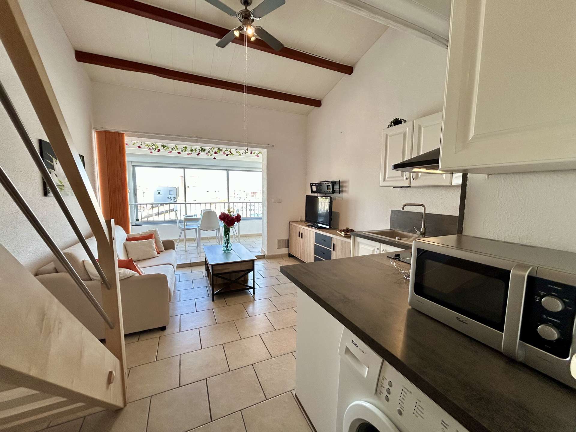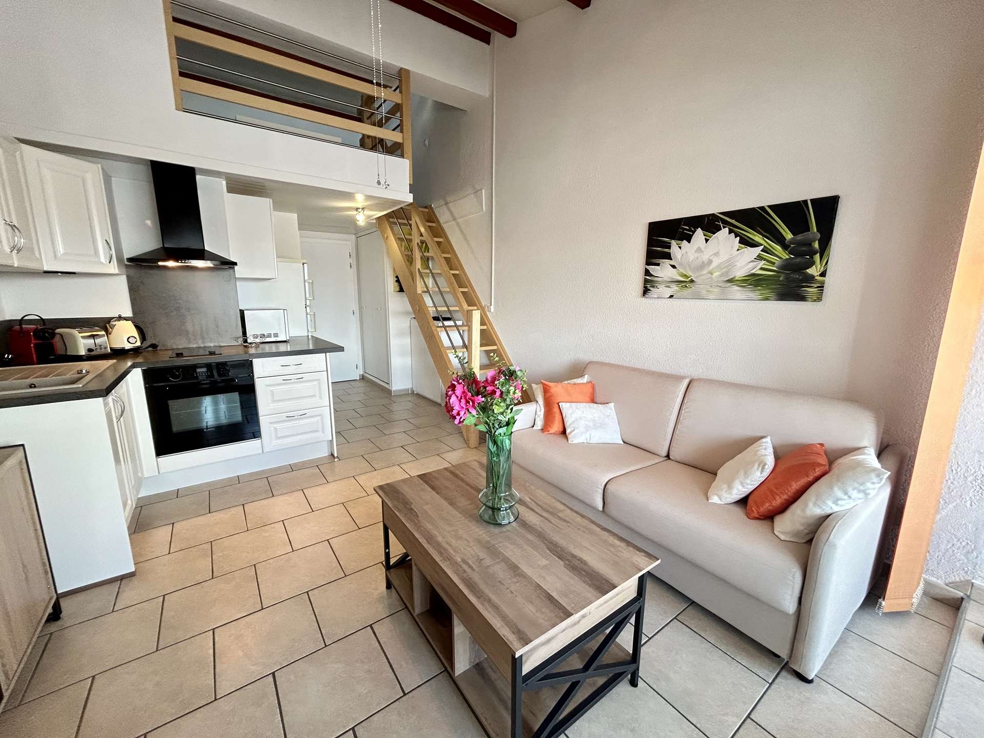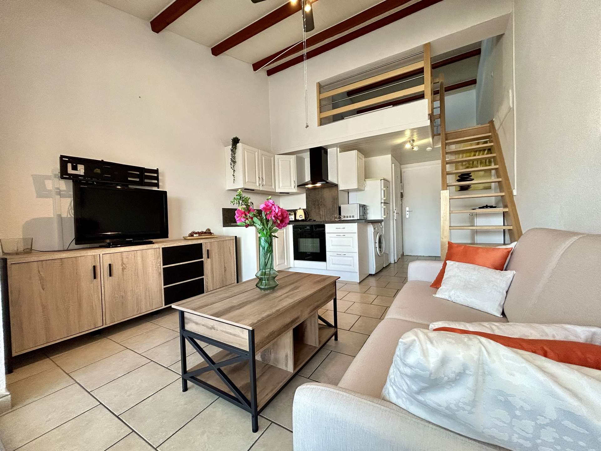 Cet appartement de vacances situé au 3ème étage sans ascenseur comprend un séjour avec 1 canapé convertible et une télévision écran plat, une chambre en mezzanine avec un lit double et un grand placard, un coin cuisine équipé et une salle de douche avec WC.