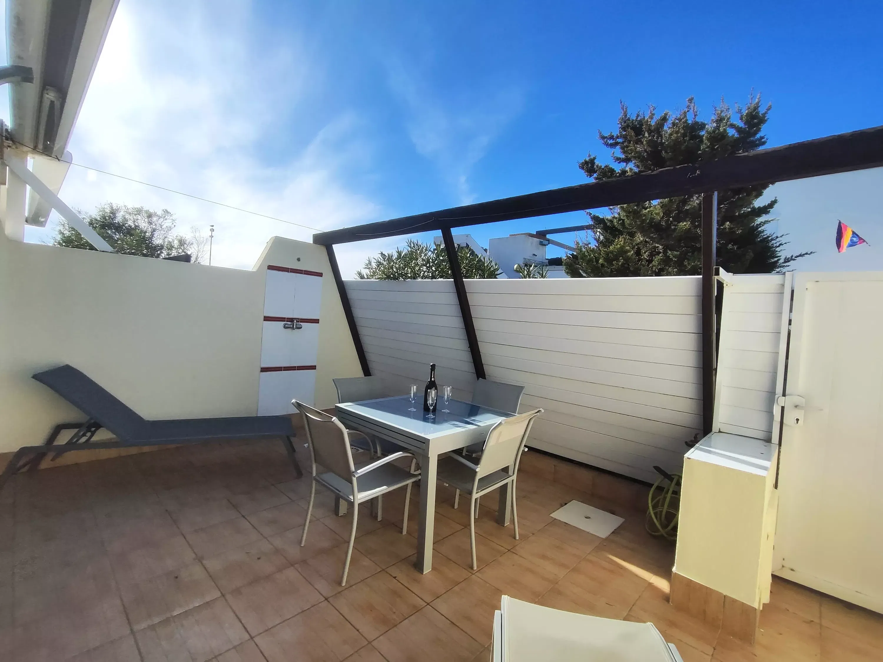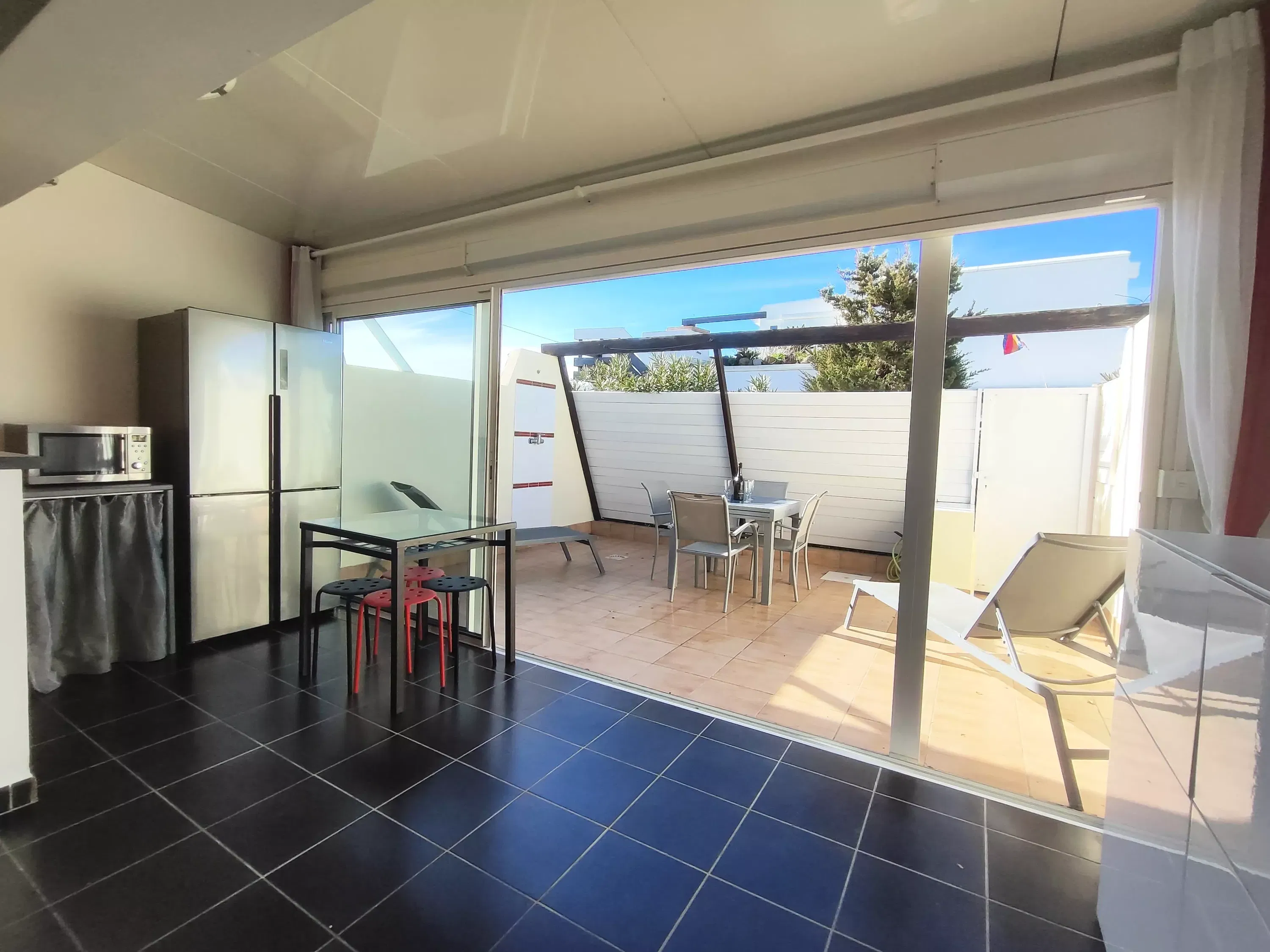Air-conditioned, west-facing villa for 2 people, 40 m², located on the ground floor in Port Nature Village. Living room with TV. Kitchenette with American-style refrigerator, microwave, toaster, kettle, Senseo coffee machine, dishwasher, and washing machine. One separate bedroom with a window and a double bed (140 cm). Shower room with separate toilet. Vacuum cleaner, safe, iron and ironing board. Large enclosed terrace with sun loungers and shower. Parking space #06.