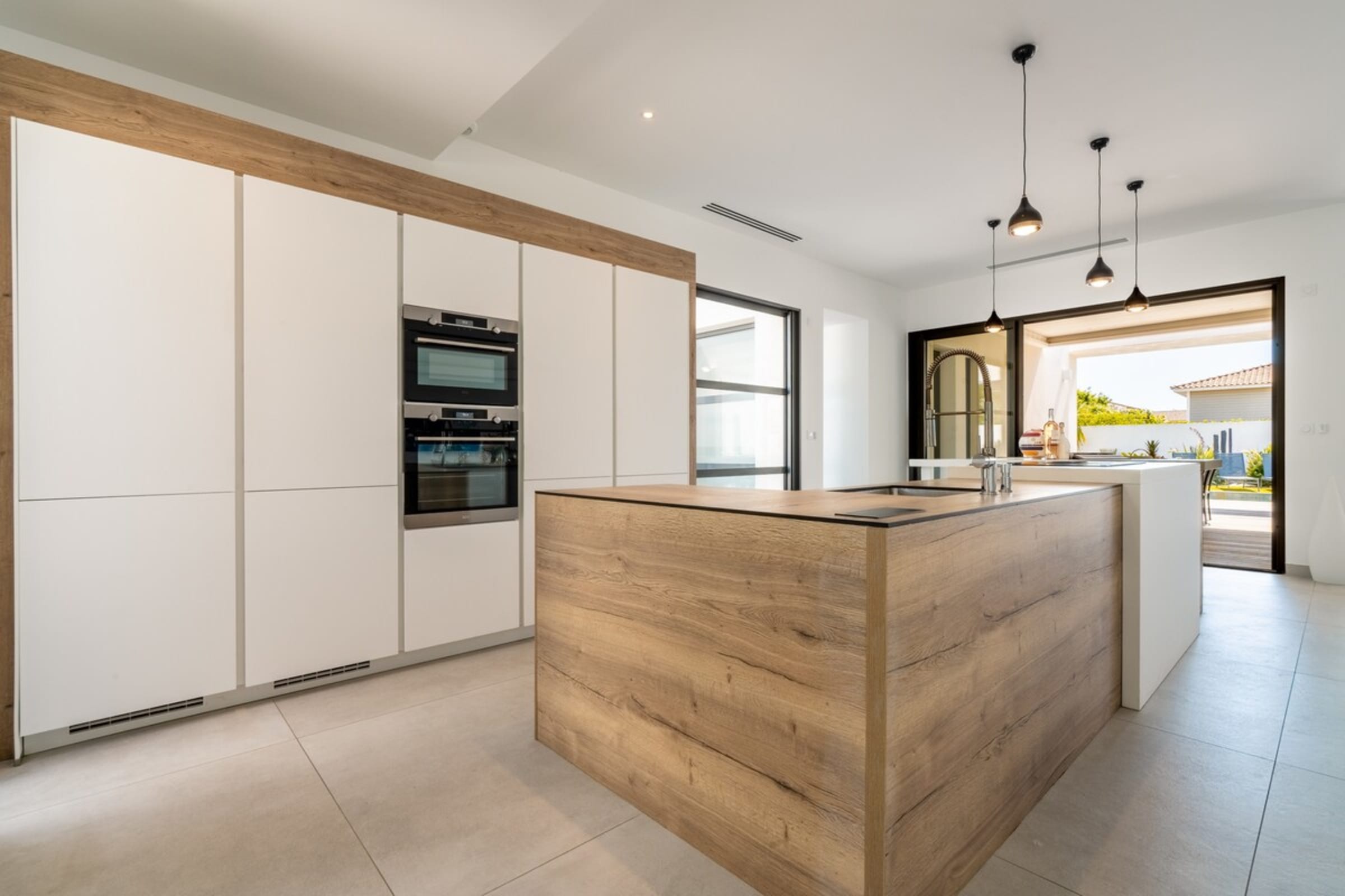 The open-concept living room with its oversized sofa flows into a bright, fully equipped kitchen with direct access to the outdoor plancha area—perfect for grilling and alfresco dining with friends and family.