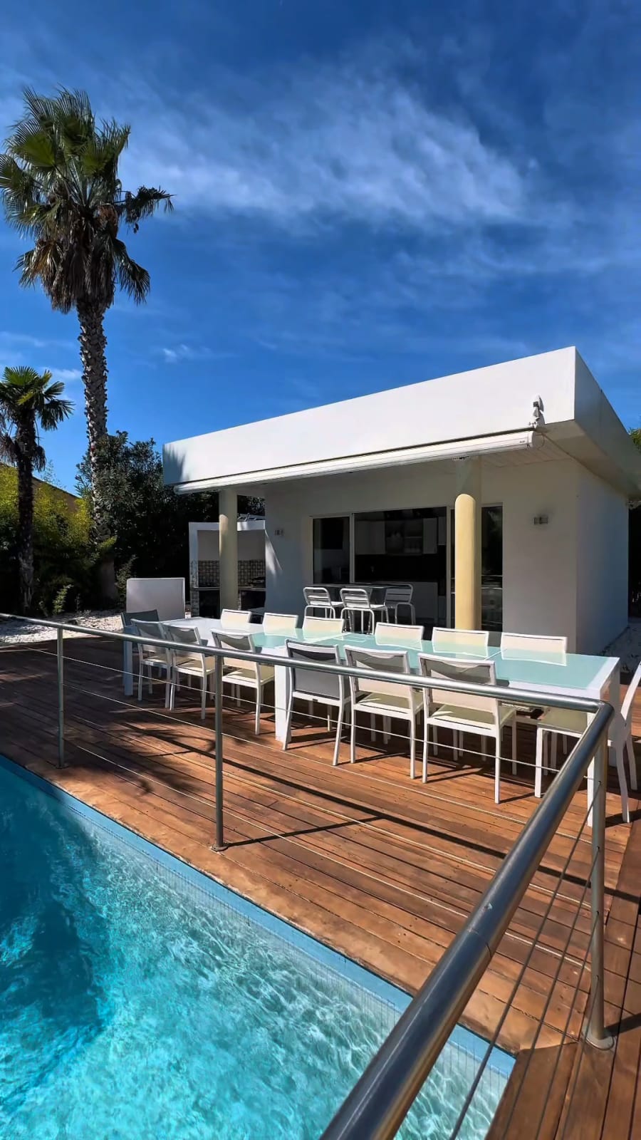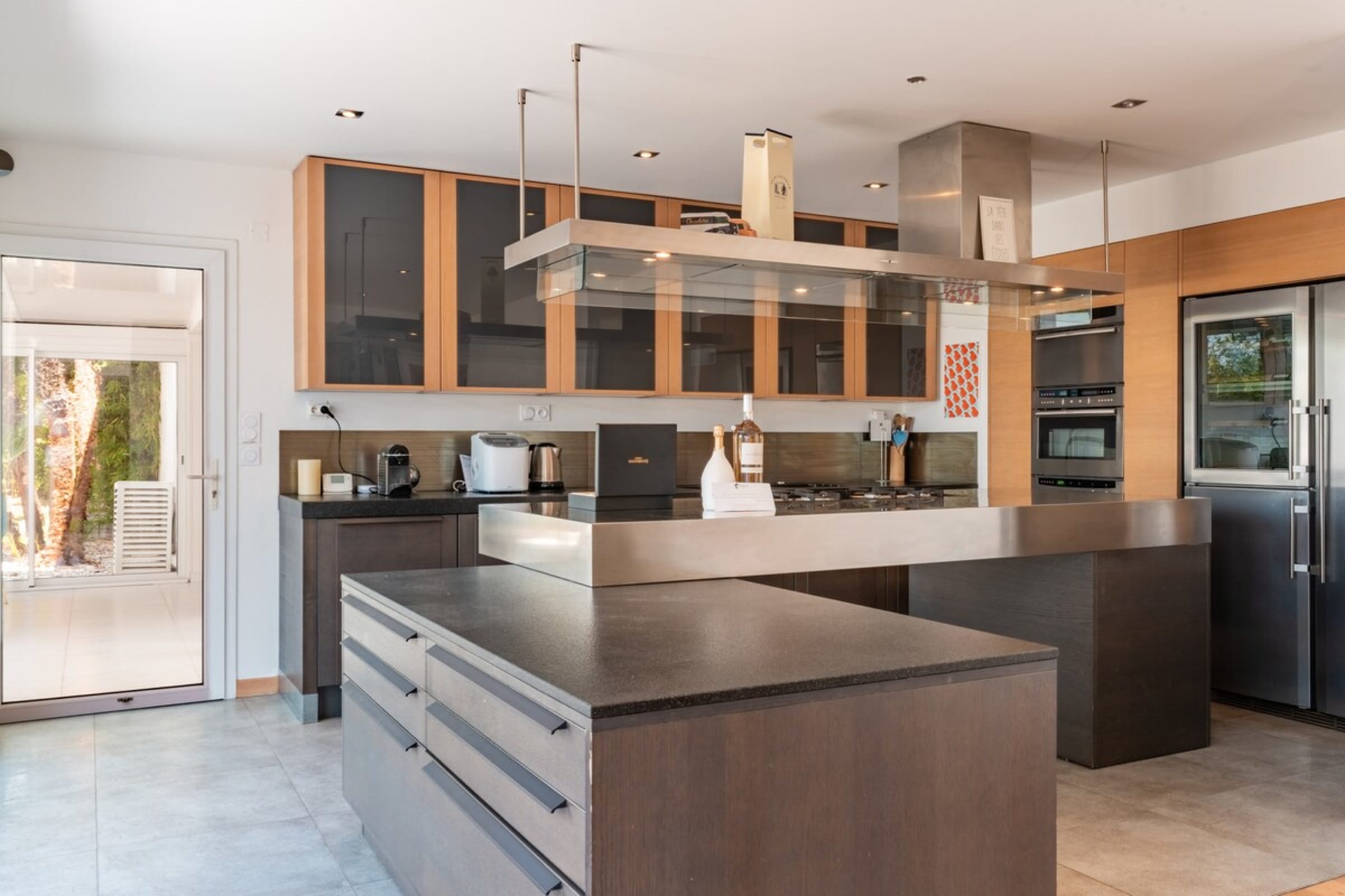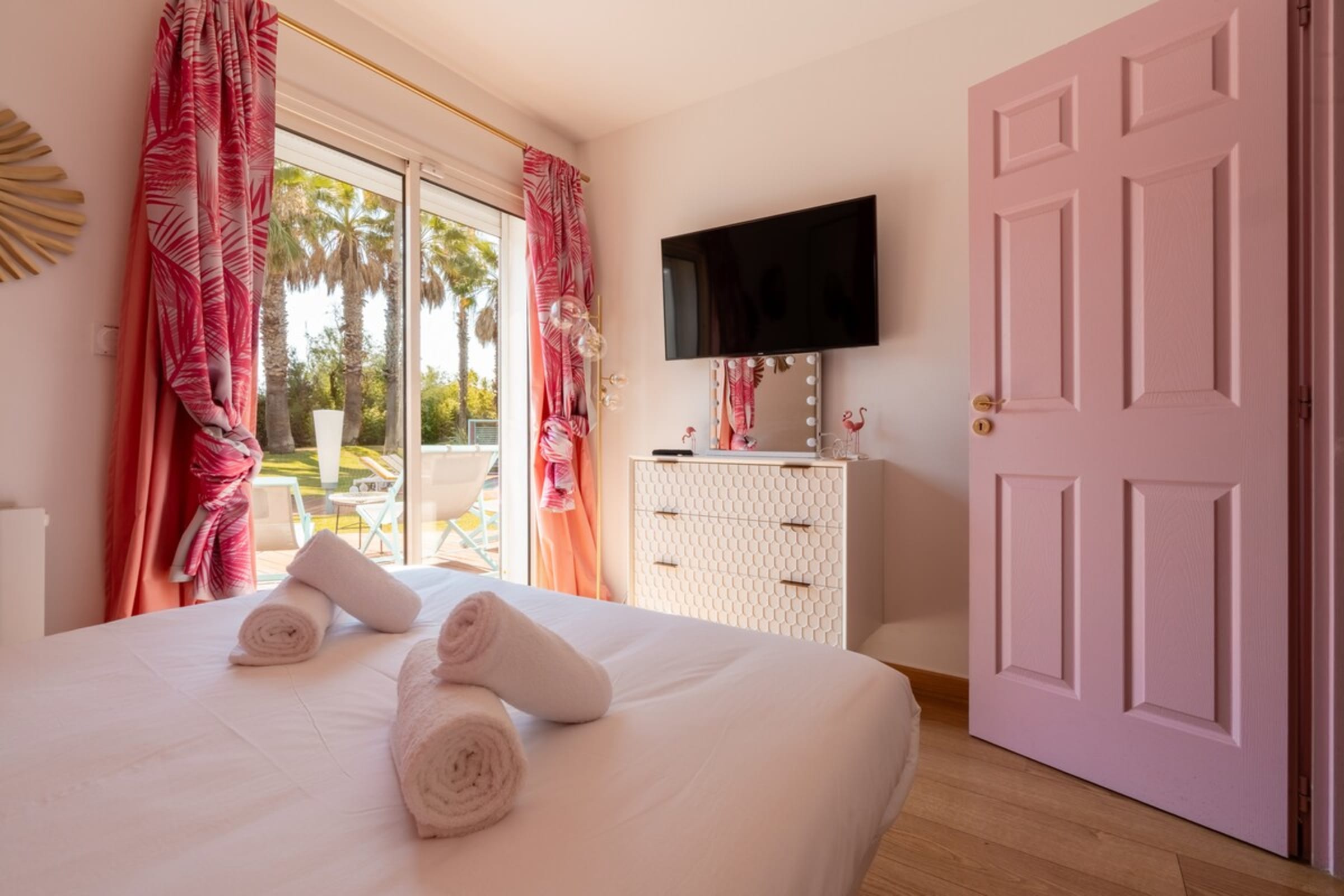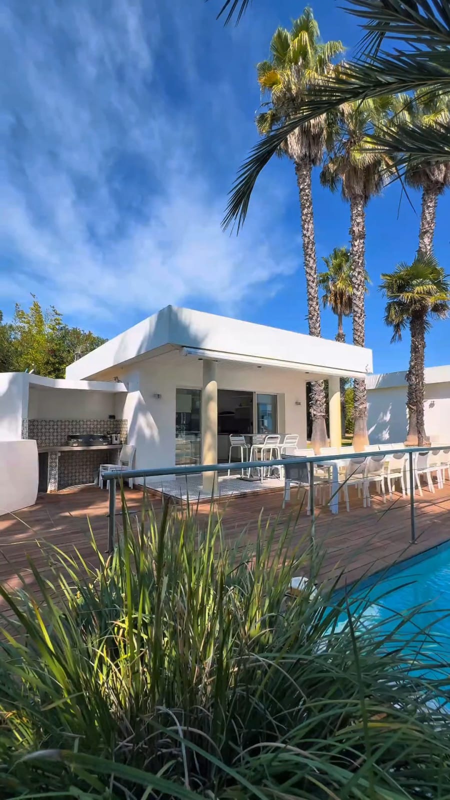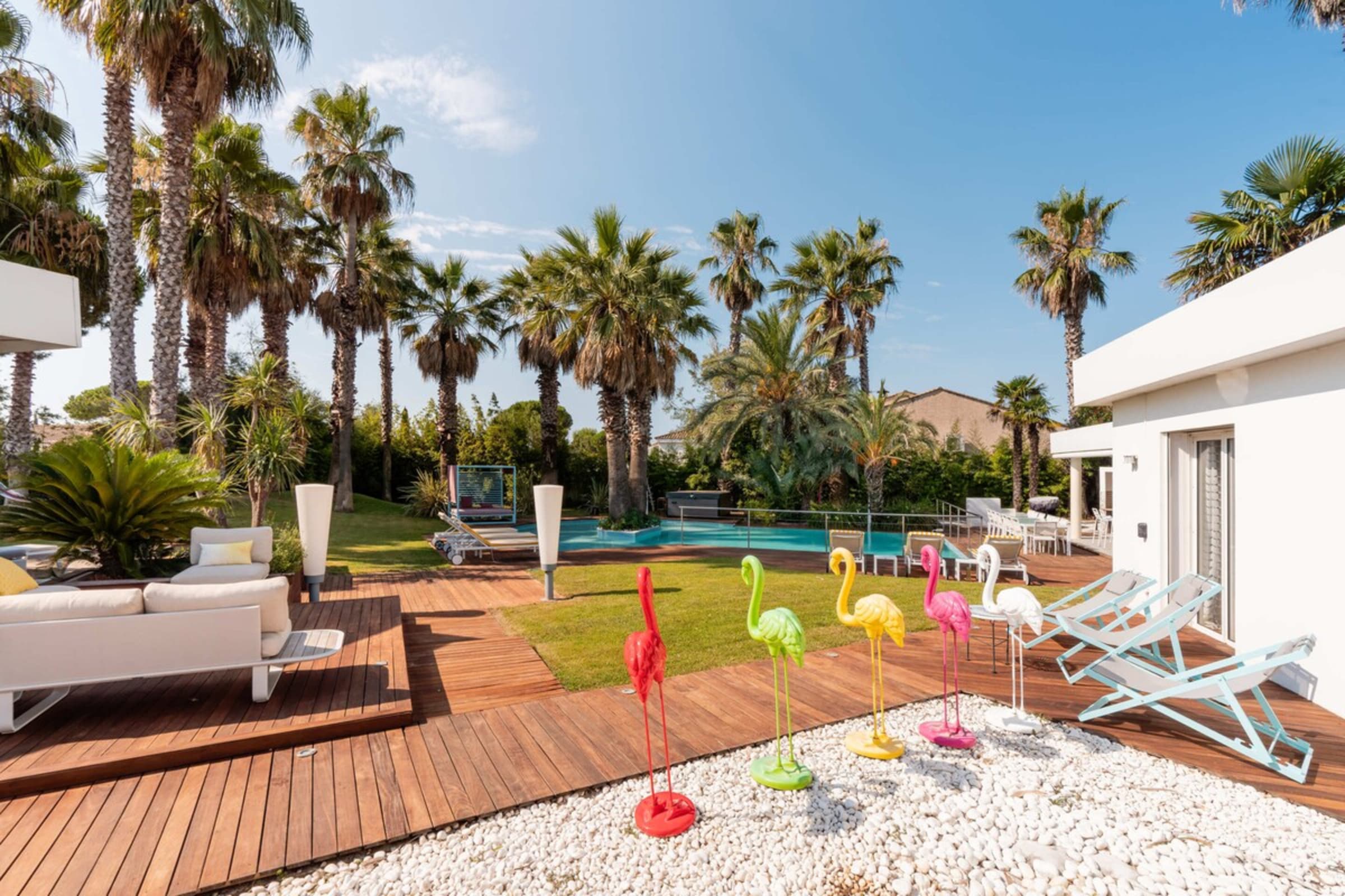 With 8 sumptuously adorned bedrooms, "Summer Wind" is perfect for those seeking family moments and tranquility. The dynamic and colorful interiors of the villa reflect the charm of Mediterranean living. Stepping outside, the vast garden, adorned with numerous palm trees, surrounds a 12x5m pool with an island featuring two palm trees, a summer kitchen, and a jacuzzi – a true relaxation oasis.