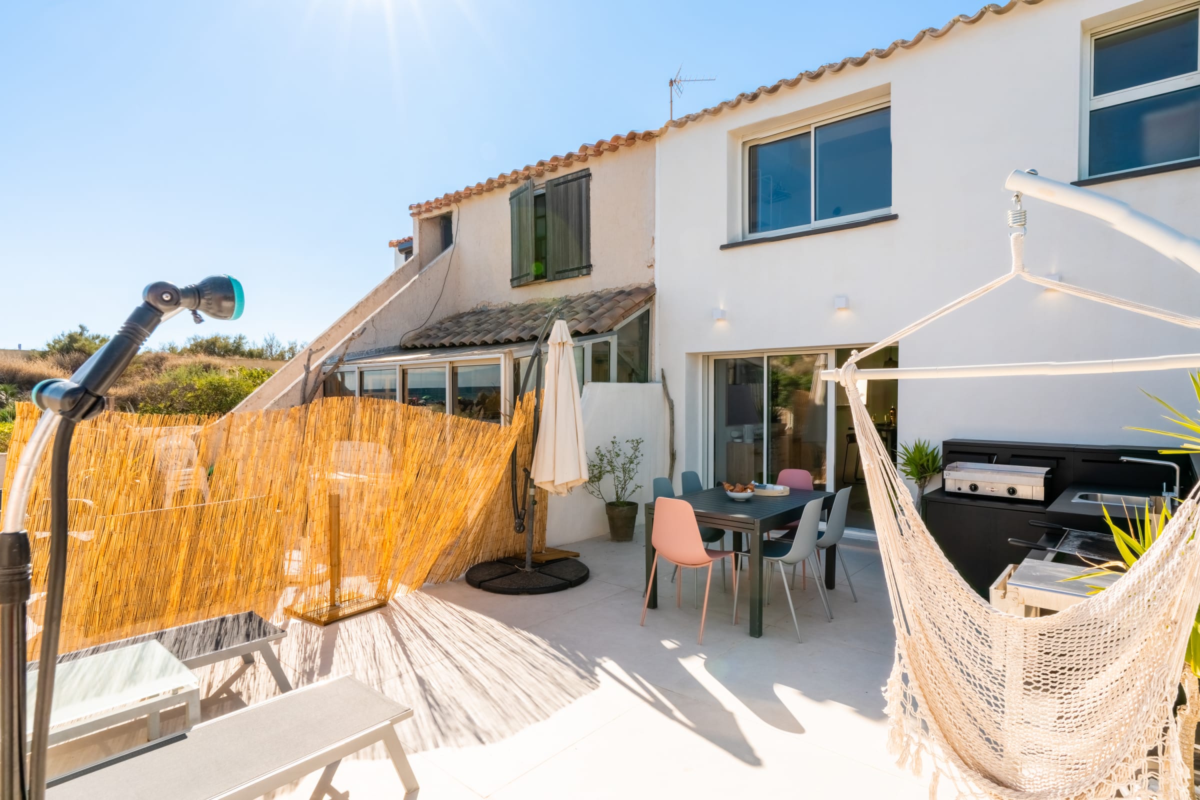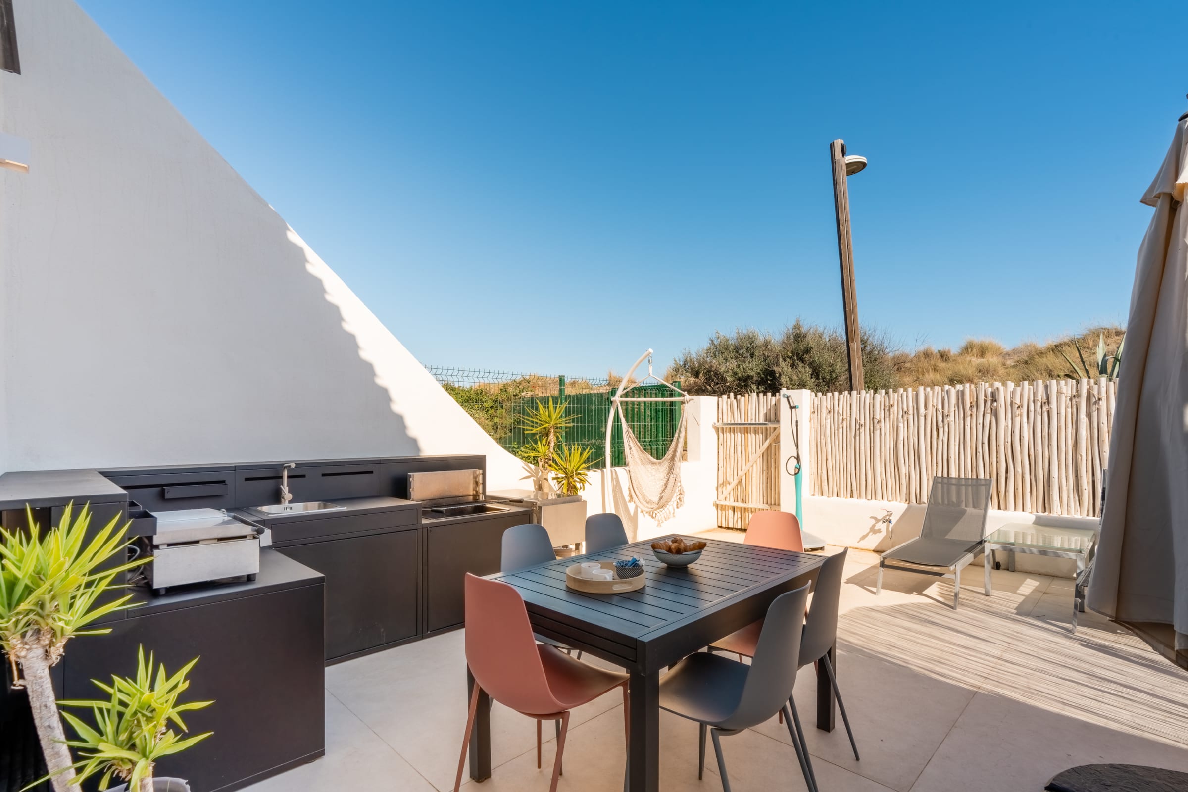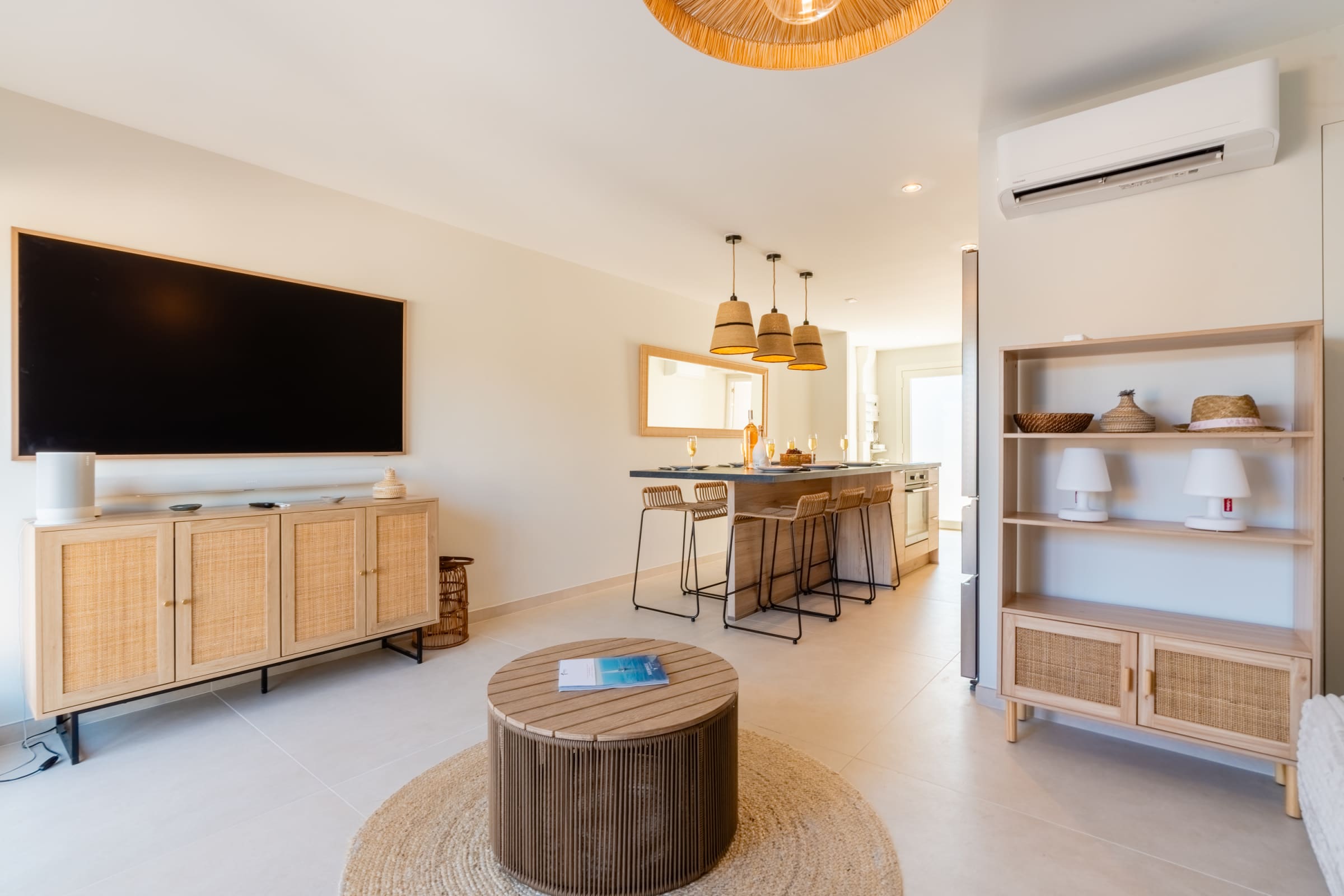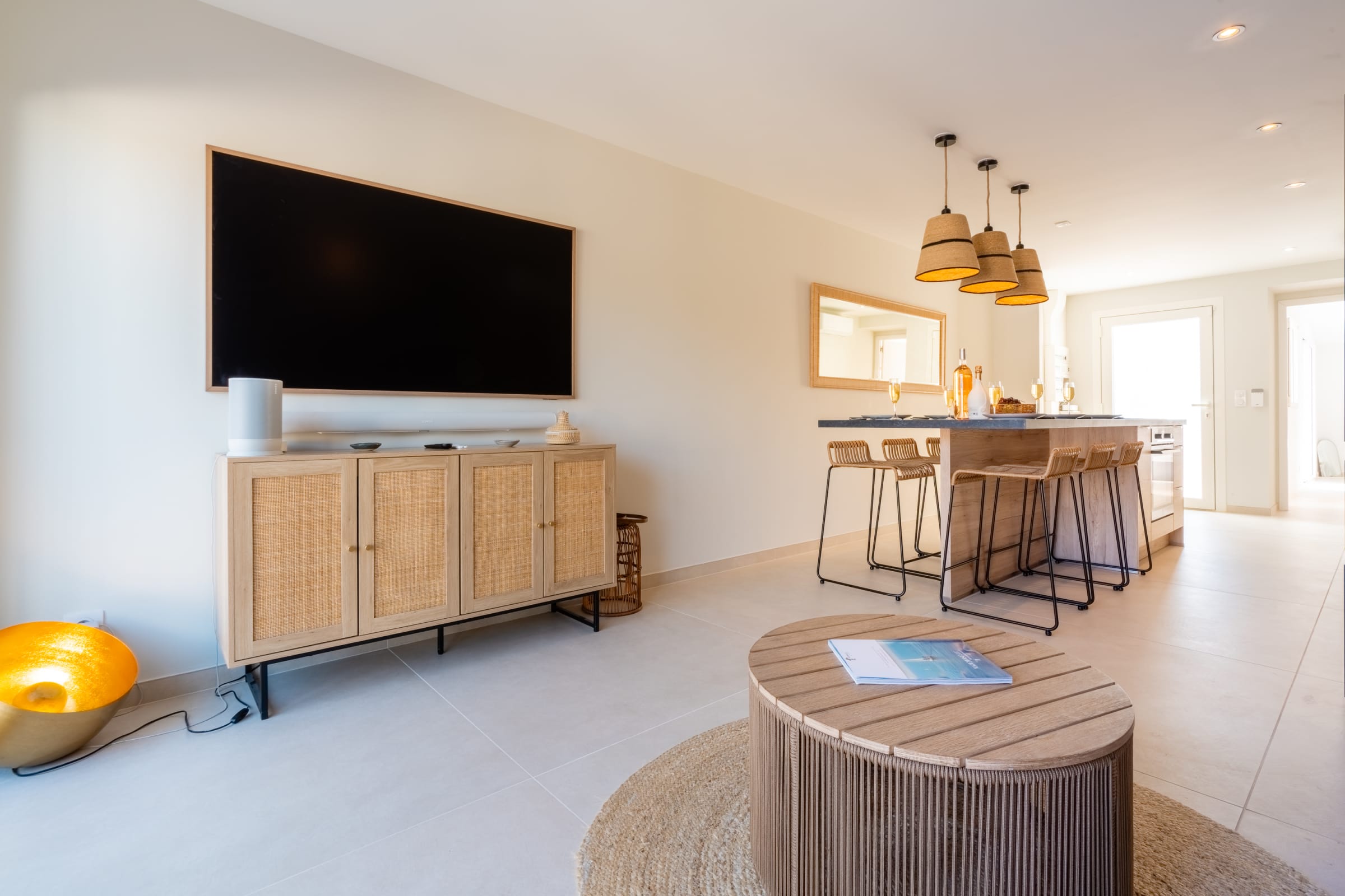 The living area gathers everyone around a large island: a fully equipped kitchen for casual cooking or hosting, and a comfortable lounge with 65" Samsung Frame and Sonos soundbar. Outside, the summer kitchen features a worktop, plancha and barbecue; the 30 m² terrace fits loungers and a big table for sunbathing, reading or shared meals.