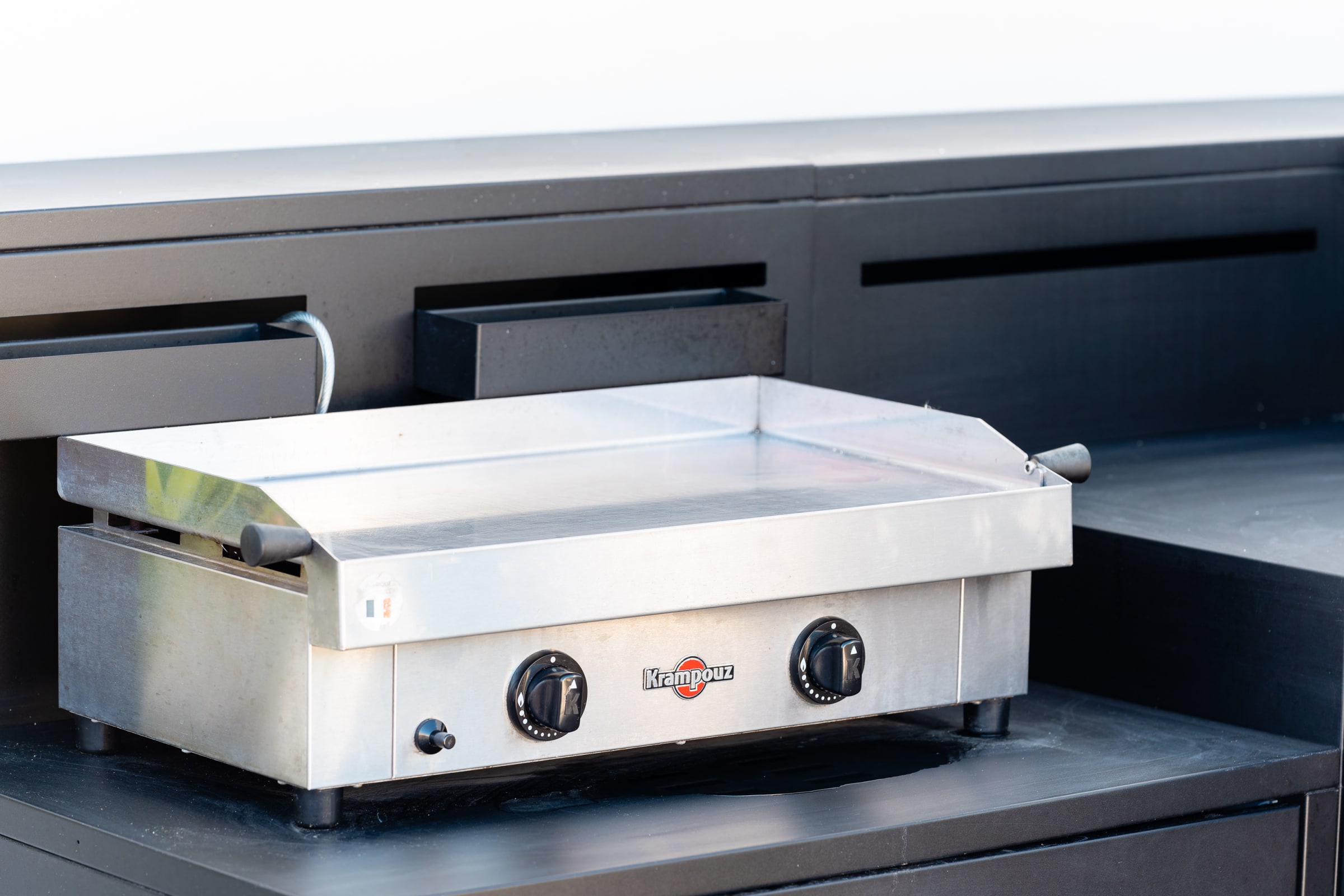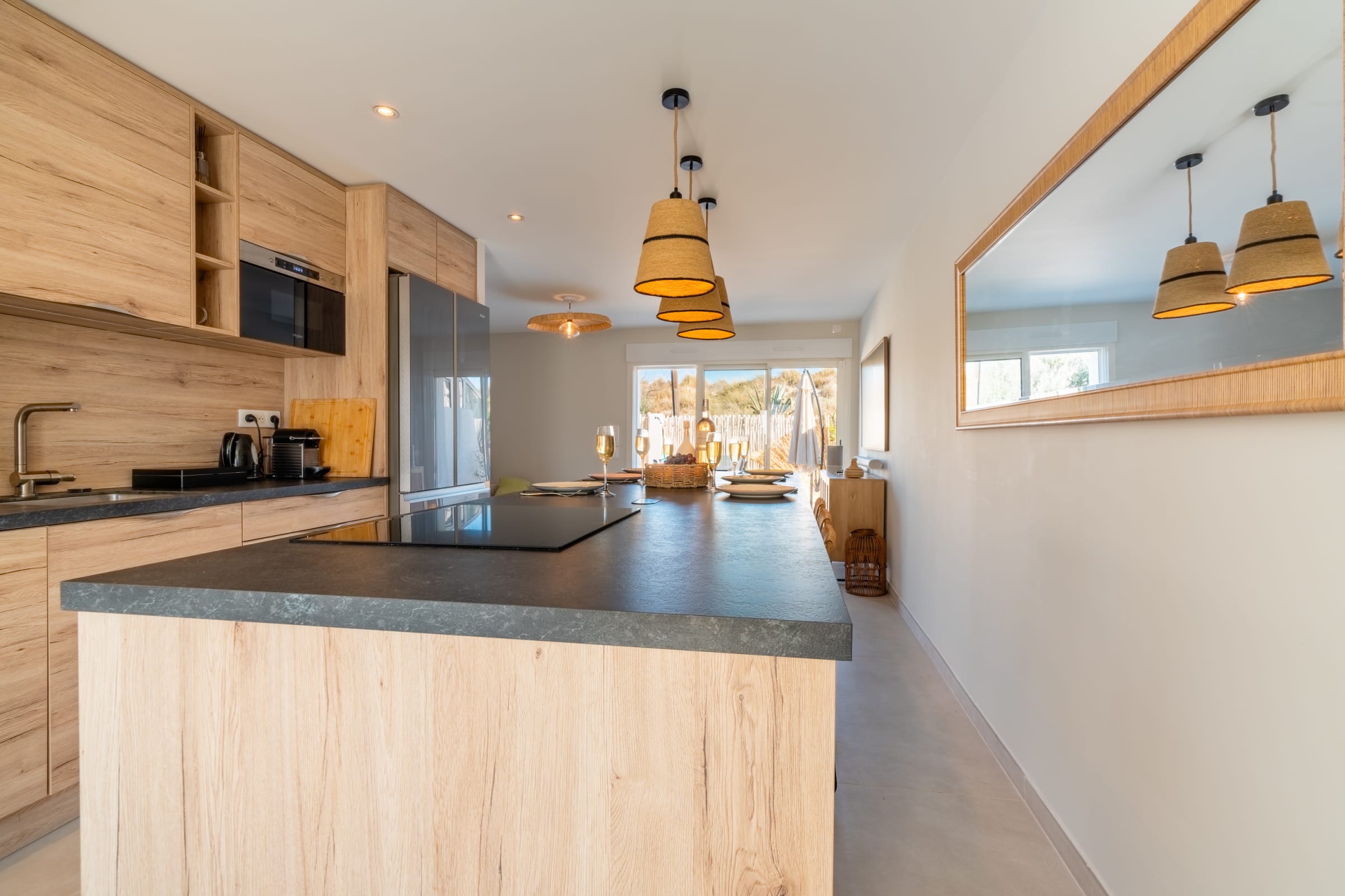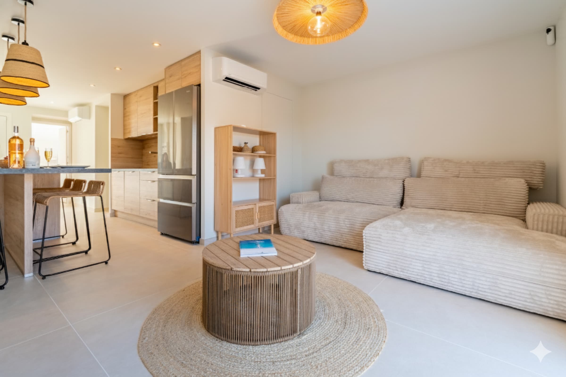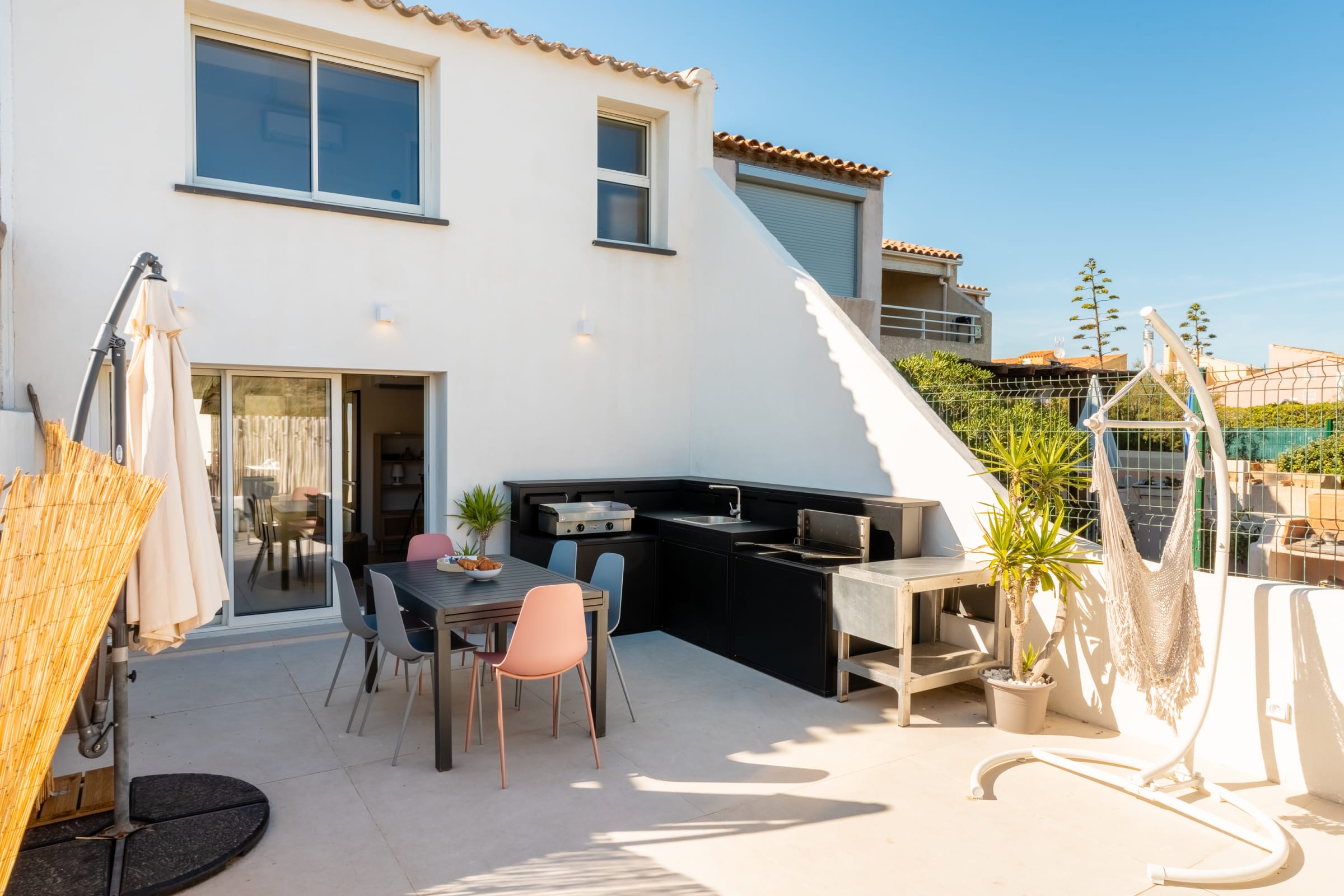 The living area gathers everyone around a large island: a fully equipped kitchen for casual cooking or hosting, and a comfortable lounge with 65" Samsung Frame and Sonos soundbar. Outside, the summer kitchen features a worktop, plancha and barbecue; the 30 m² terrace fits loungers and a big table for sunbathing, reading or shared meals.