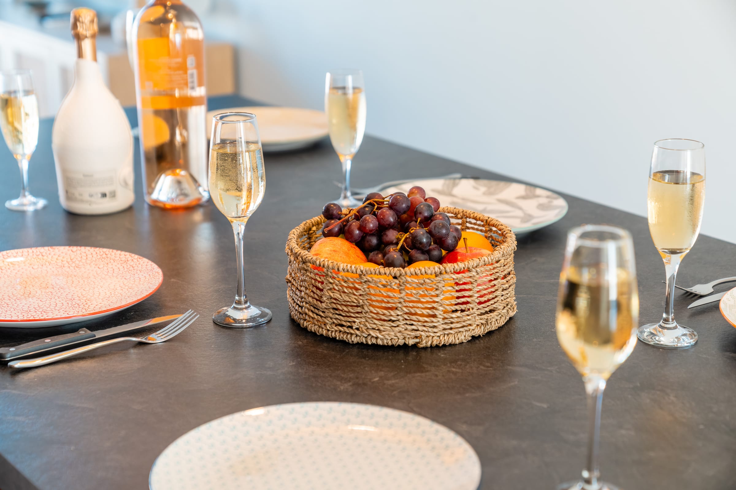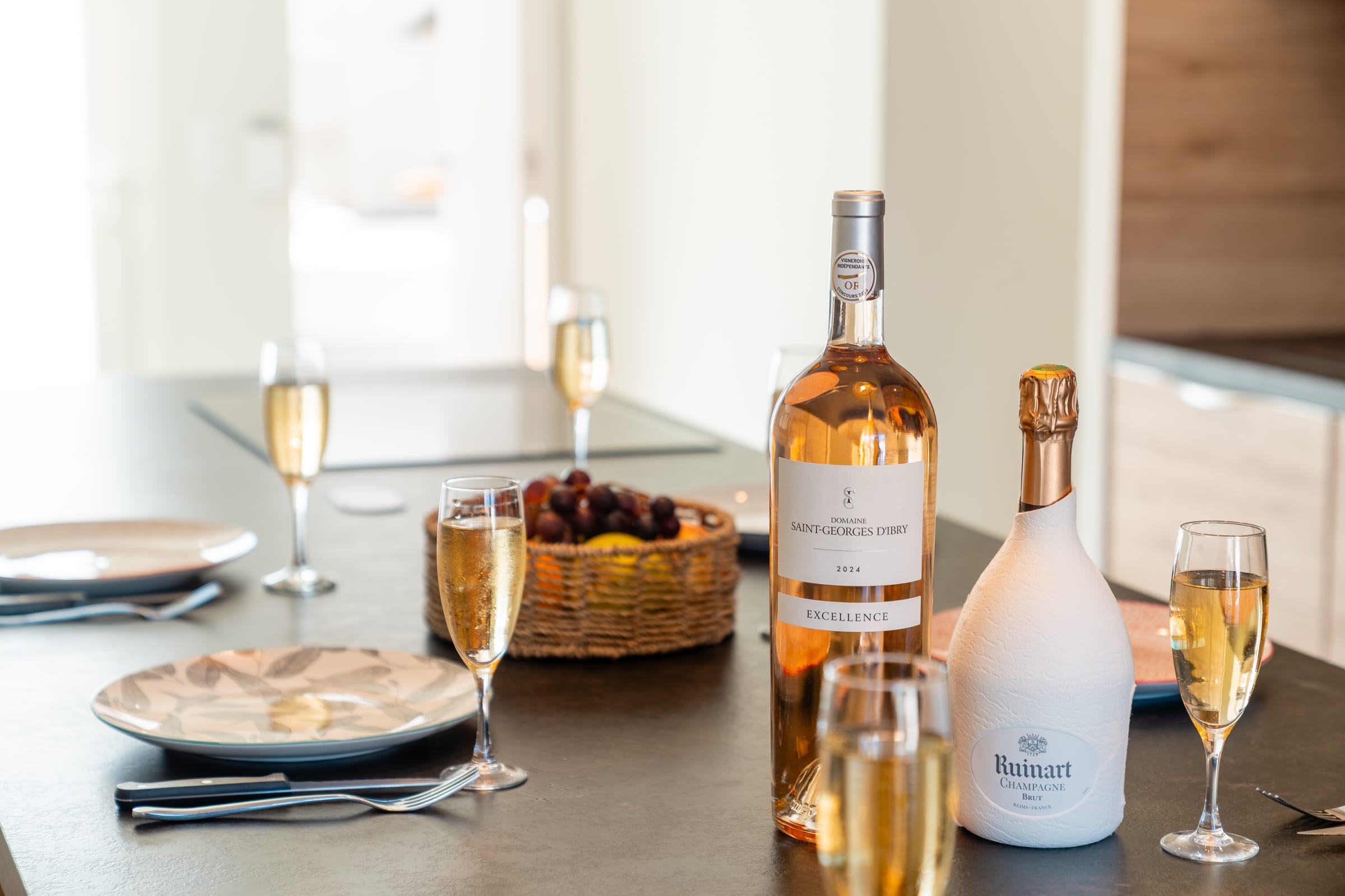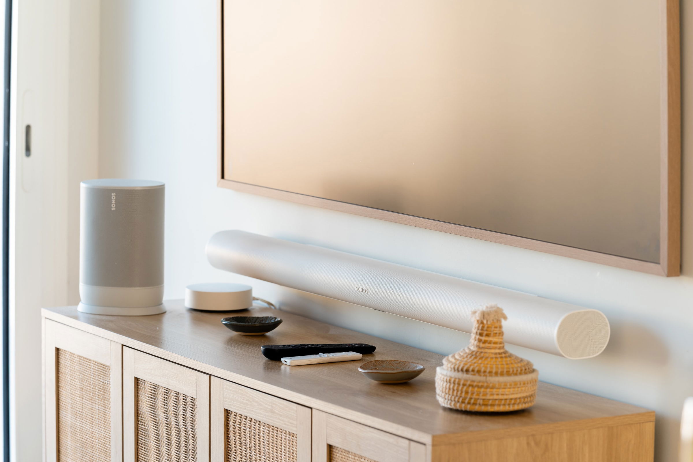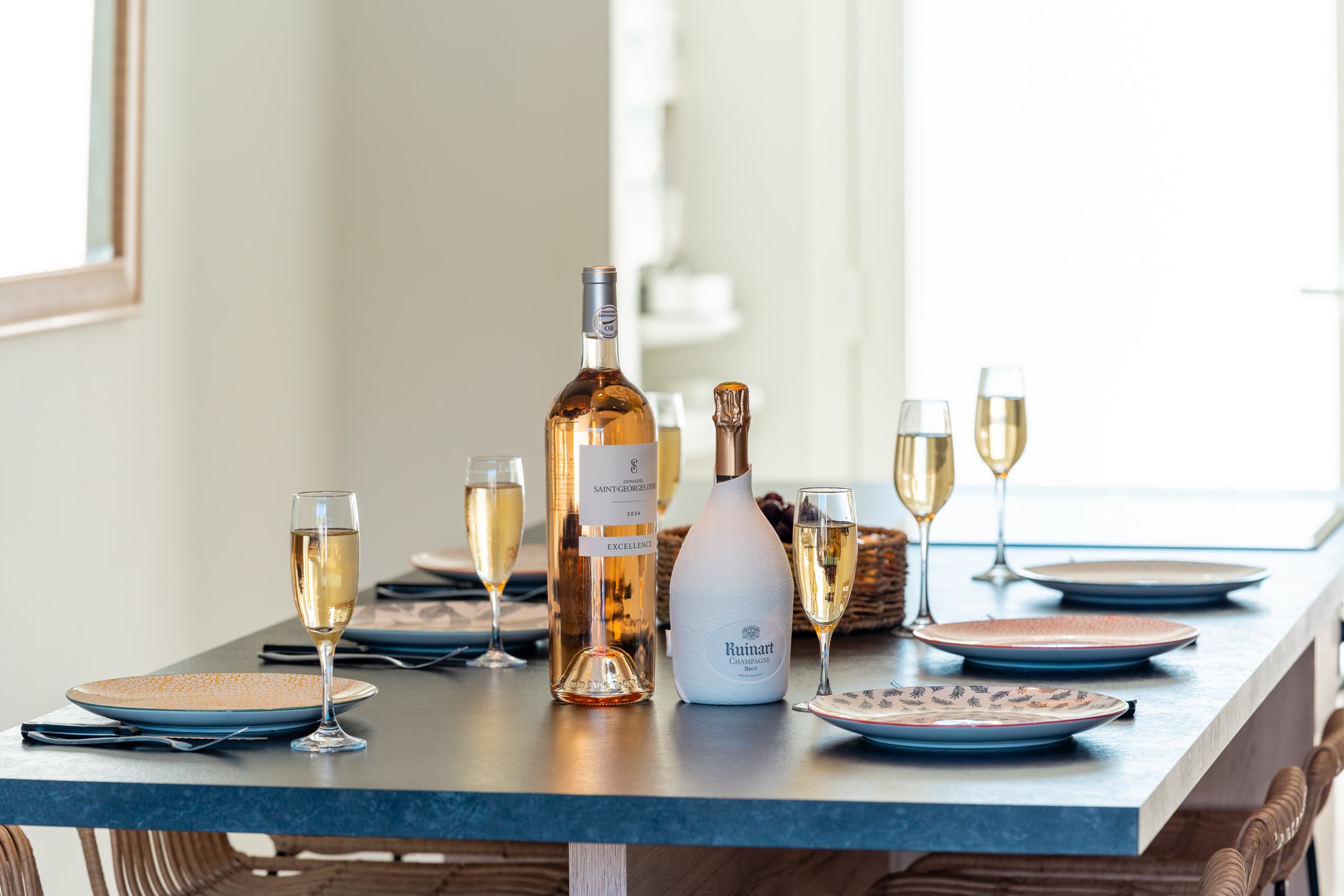 The living area gathers everyone around a large island: a fully equipped kitchen for casual cooking or hosting, and a comfortable lounge with 65" Samsung Frame and Sonos soundbar. Outside, the summer kitchen features a worktop, plancha and barbecue; the 30 m² terrace fits loungers and a big table for sunbathing, reading or shared meals.