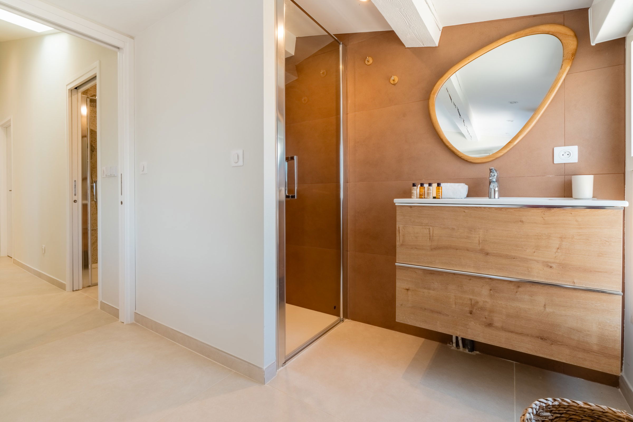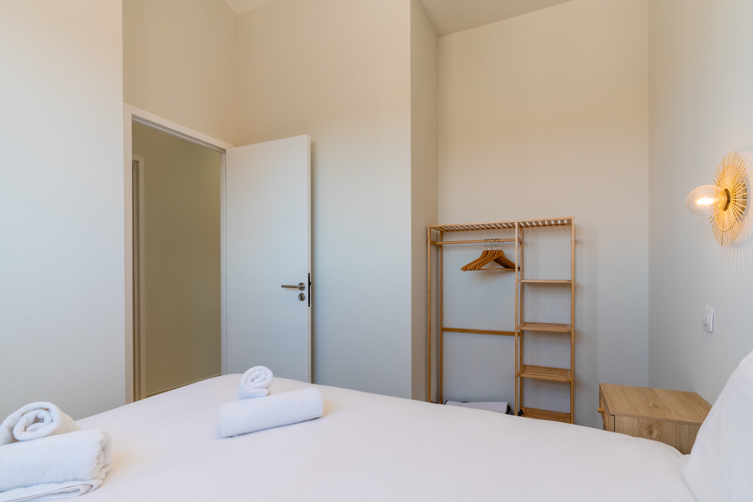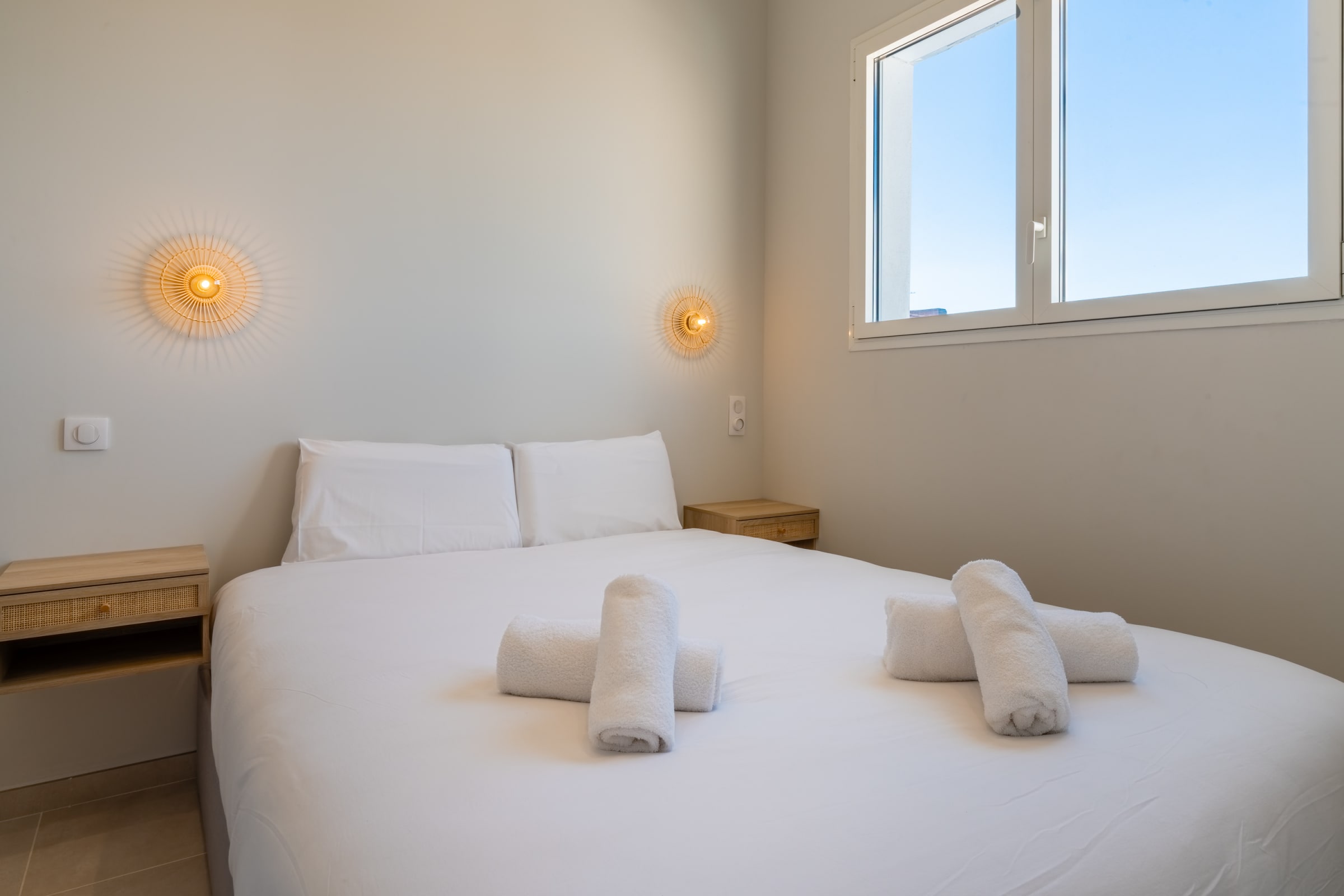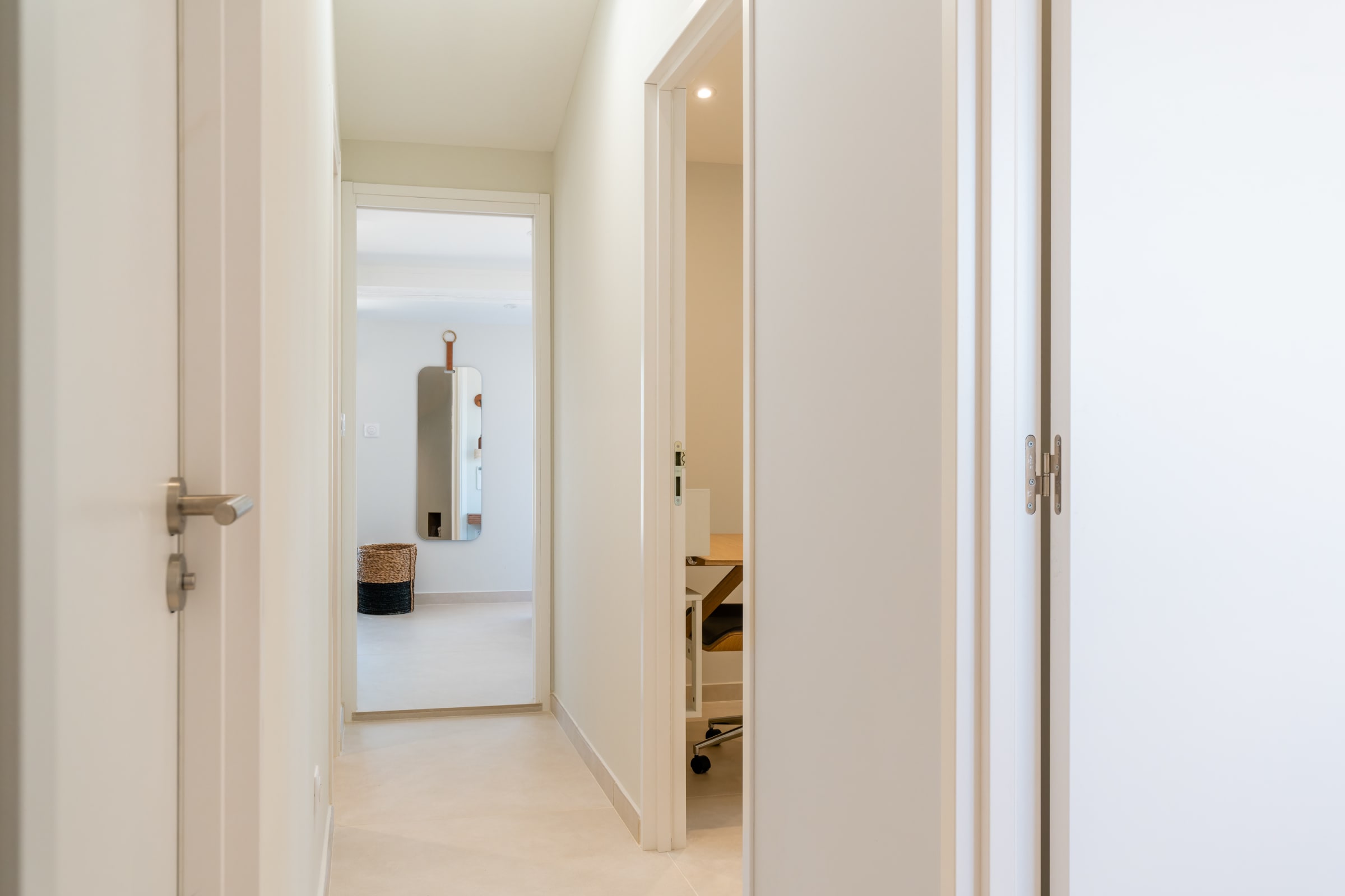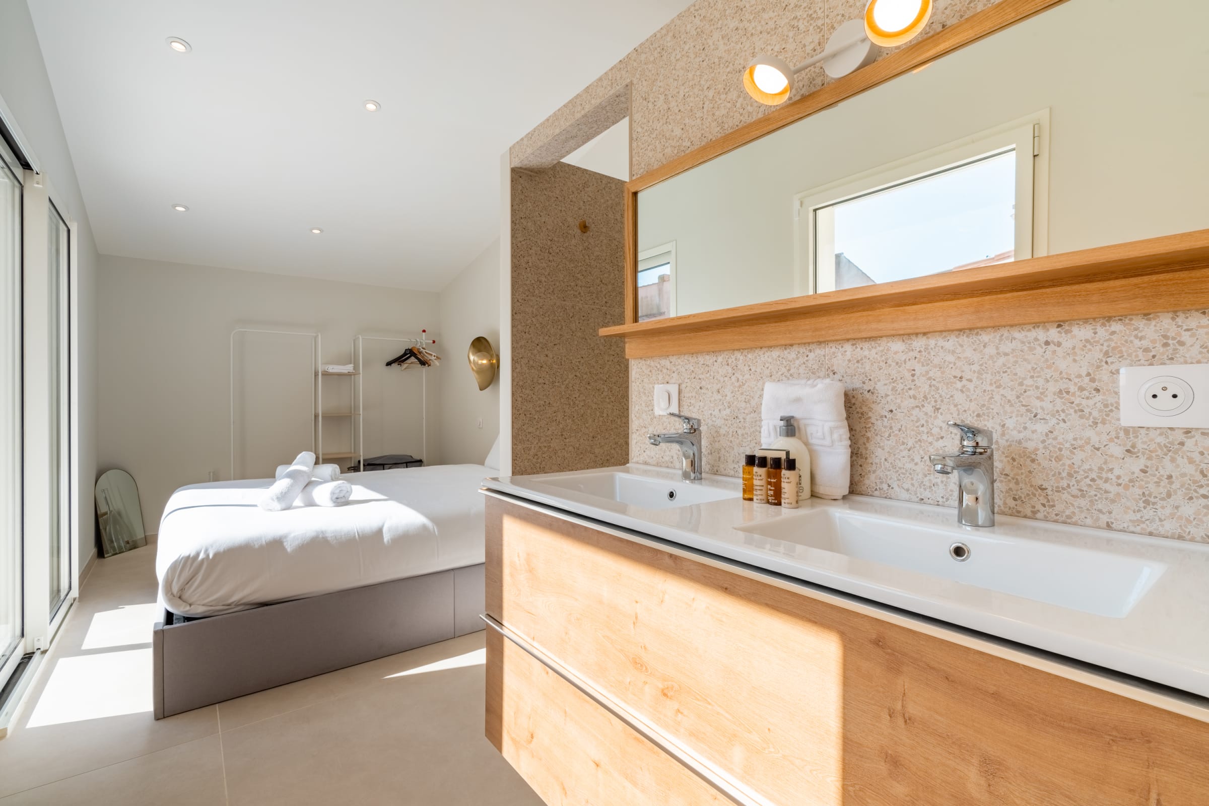 Night side, the layout favors ease: on the ground floor, a suite with private shower room. Upstairs, three bedrooms: a large suite with a panoramic window facing the beach (sea view from the bed), a double bedroom with clean lines, and a home-office bedroom designed for remote work, with a sofa bed and a real mattress for comfortable sleeping. Soft materials, storage and calm extend the sense of rest.