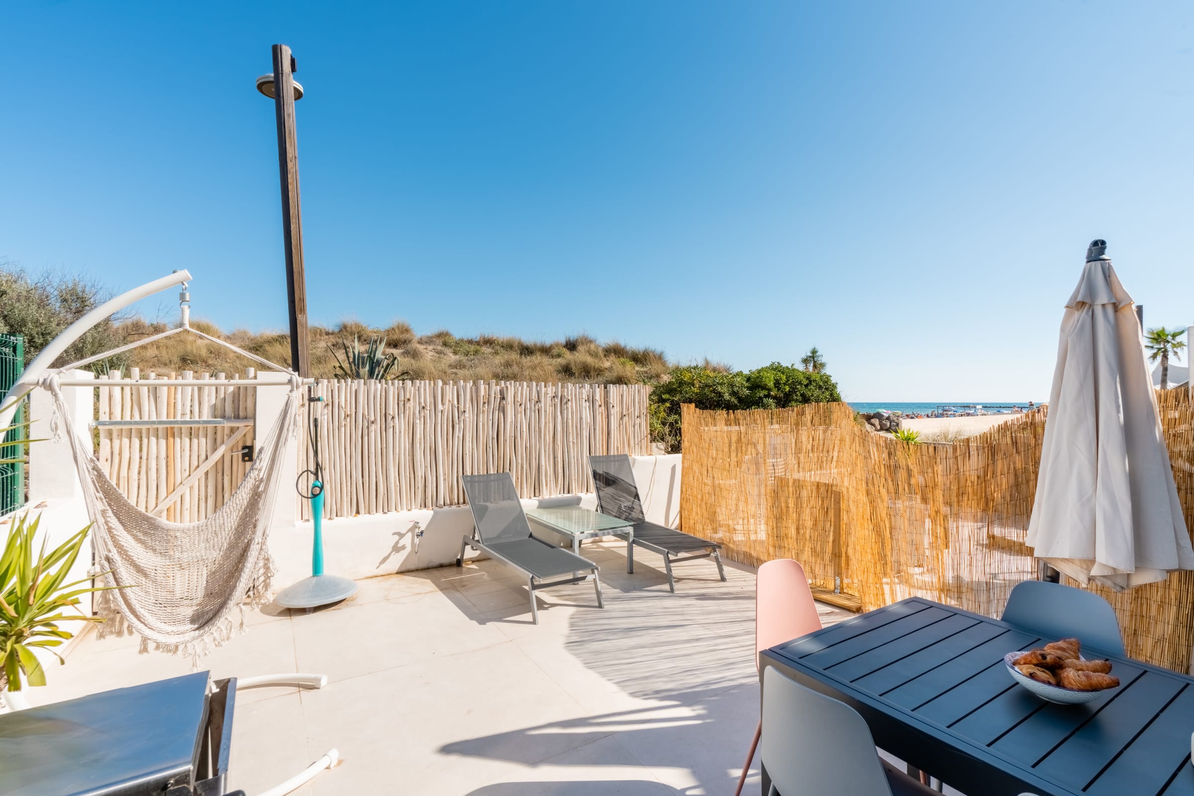 In a private, secure residence in Cap d’Agde, Villa Roquille offers a rare privilege: a terrace gate leading directly to La Roquille beach. Live by the sea’s rhythm—morning dips, naps to the sound of waves, open-air dinners with the horizon as your backdrop.
