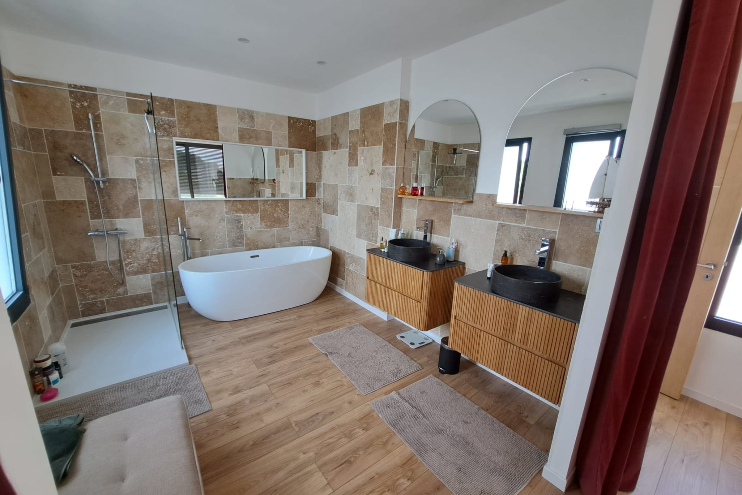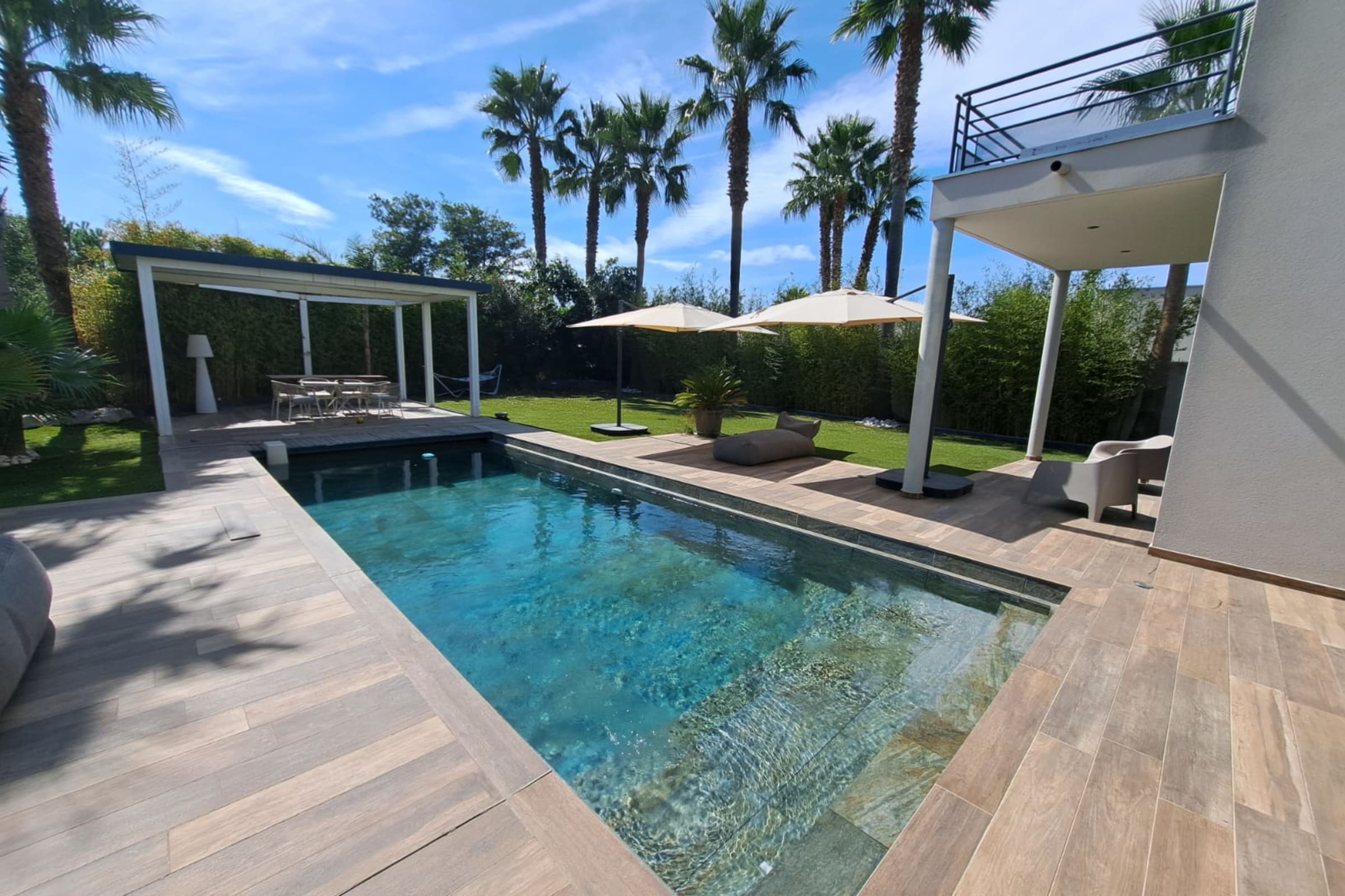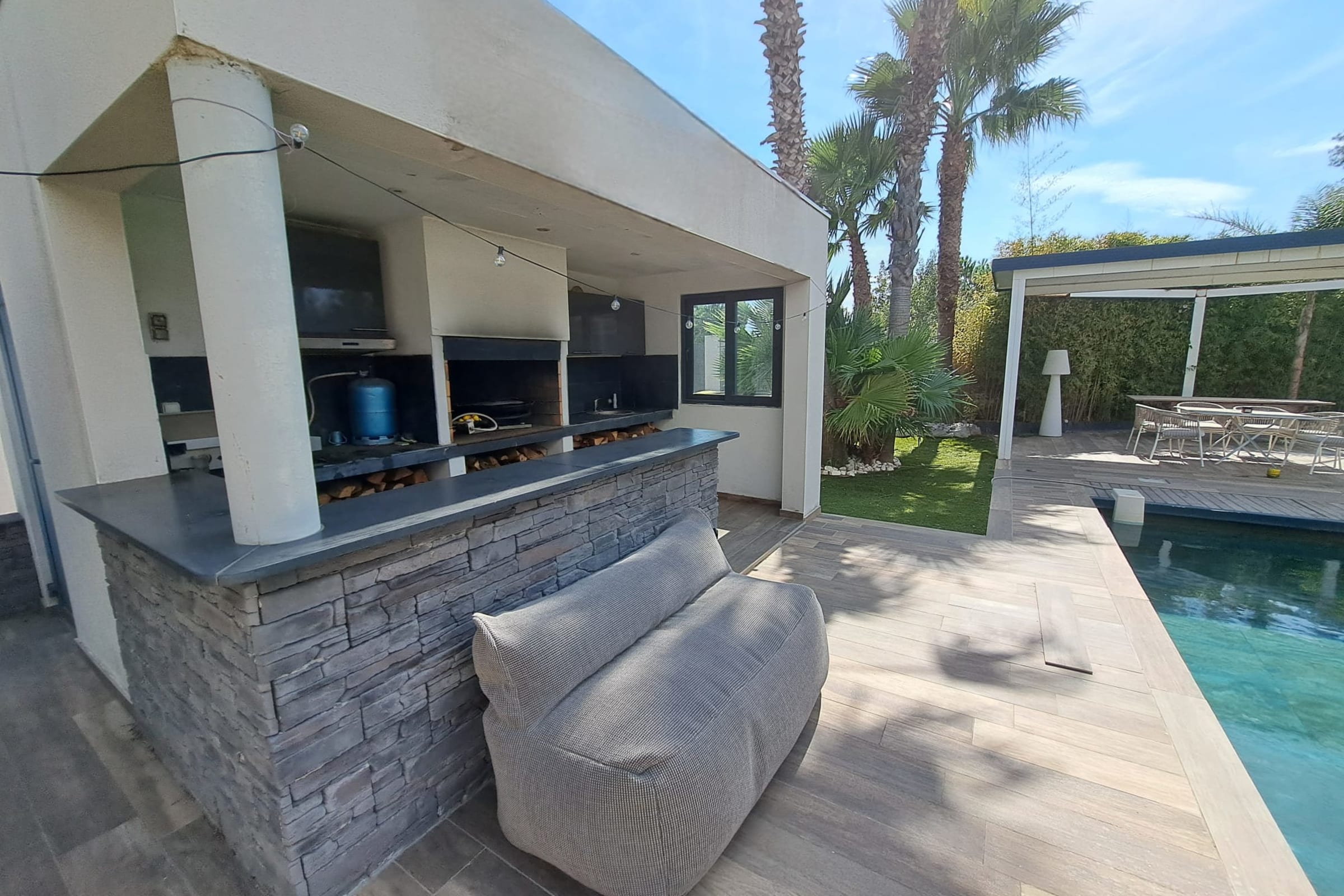Outside, the villa reveals its true art of living: an 11 x 4 m Bali stone pool, 1.5 m deep, surrounded by sun loungers and extended by a stylish pool house with summer bar. Perfect for alternating swims, aperitifs and dinners under the stars in a chic, relaxed atmosphere.